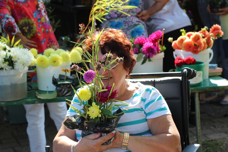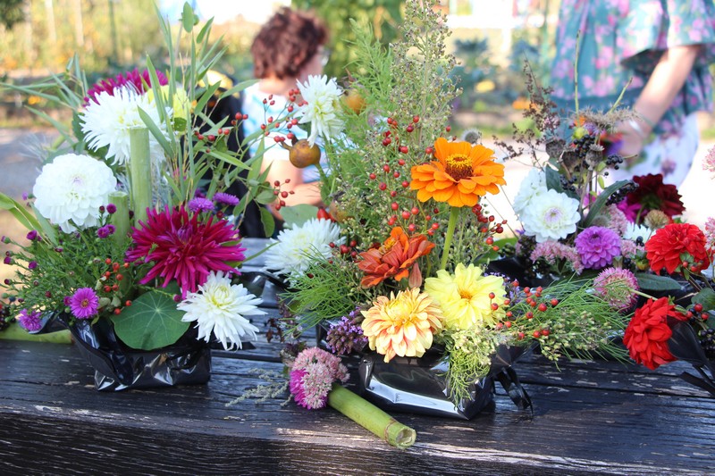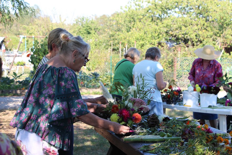 Tous les éléments cueillis viennent rejoindre les fleurs de dahlia, roses, verveine, brins de lavande et autres fleurs déjà sur les tables. Christophe donne quelques consignes pour le piquage dans la mousse puis chacune peut exprimer son talent. Les premiers arrangements floraux prennent forme et Christophe prodigue quelques conseils pour les rendre encore plus harmonieux.