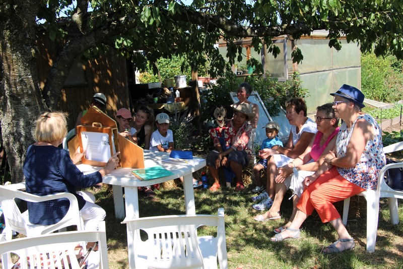 À l’heure du goûter, l’animation « Contes au jardin » accueillait les tous jeunes jardiniers à l’ombre du gros cerisier pour de belles histoires. Les animatrices de l’association « Lire et faire lire » ont su captiver les enfants par leurs contes et des kamichibaïs dans lesquels se côtoyaient entre autres, un épouvantail triste de devoir faire peur aux oiseaux, transformé par son ami le hérisson en une fleur chatoyante refuge de papillons, un ver de terre qui rêvait de devenir ver luisant, un jeune corbeau invité par l'épouvantail à se cacher sous son chapeau pour échapper au fermier dont il ravageait le champ, ou encore un arrosoir qui pleurait à chaudes larmes aux pieds des valérianes.