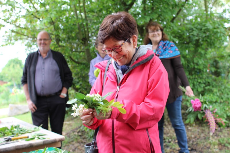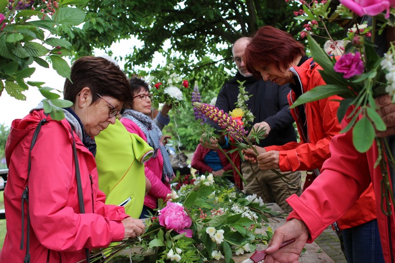 Tous les éléments sont là, en vrac sur la table pour que l'artiste qu'est Christophe exprime son talent. De la julienne des jardins, un iris, une pivoine blanche, une fleur de rhubarbe, une branche de sureau et quelques feuilles de charme, et voilà le premier bouquet qui prend forme. Les fleurs sont là, sur la table. Chaque participant(e), et oui, il y avait Alfred, confectionne son bouquet avec les conseils de Christophe. Le tas de fleurs sur la table s'épuise. Reste à faire quelques photos, boire un thé préparé par Éliane et se donner rendez-vous le 17 septembre prochain 2018 pour la confection de piquages dans la mousse.