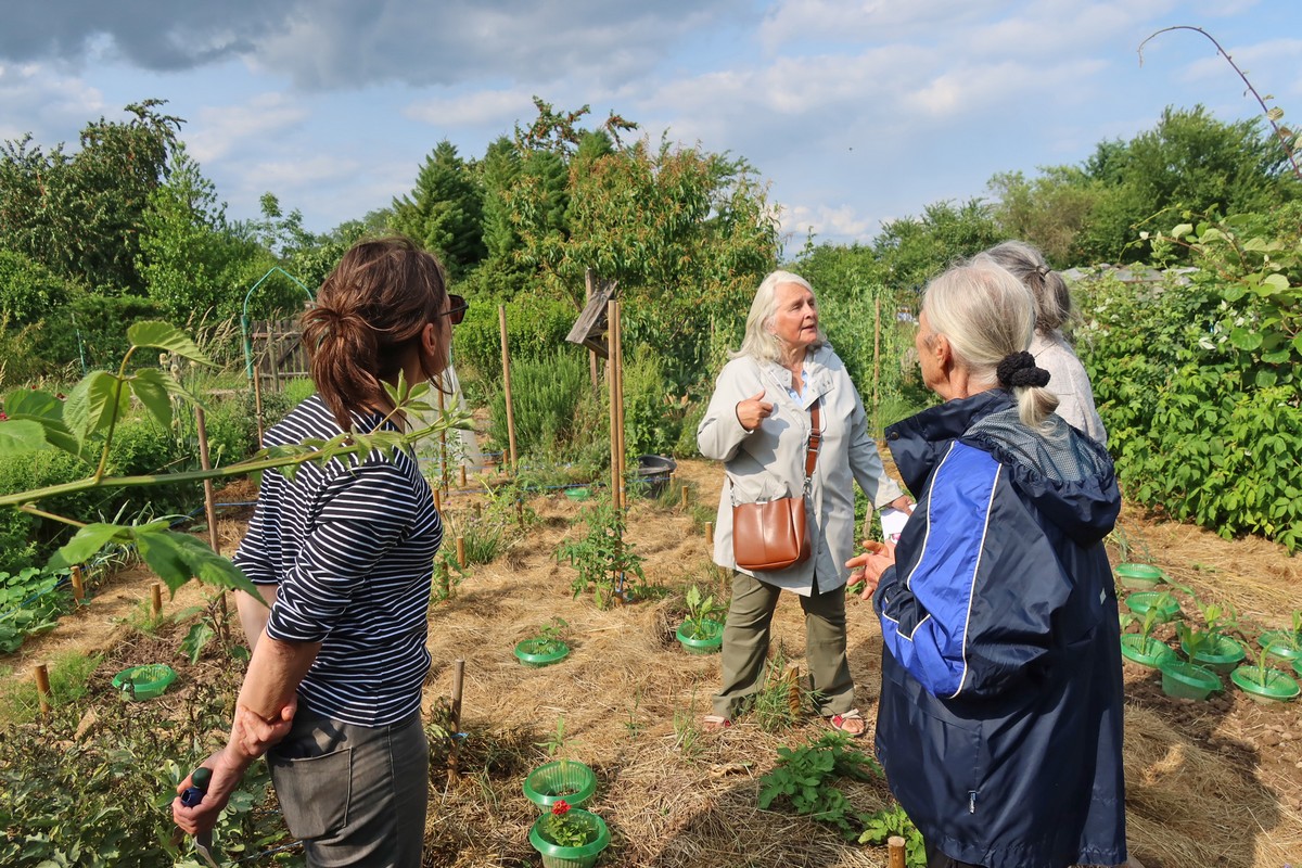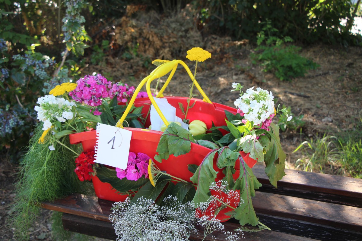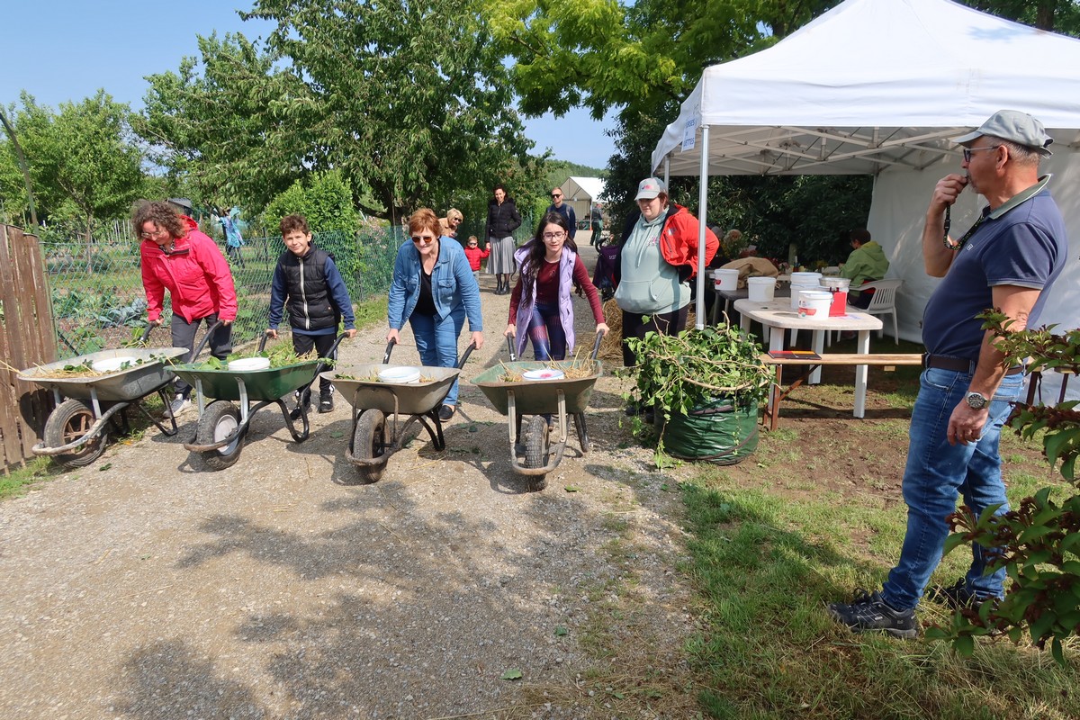 28 juin : Premier des trois après-midi festifs de la saison estivale. L'après-midi débute par l'animation jardinage pratique "1h au jardin". Malgré la canicule, quelques jardinières et jardiniers ont répondu à l'invitation. Petit tour dans le jardin de Didier remis en état après un certain laisser-aller en début de saison, lié aux activités du 100ème anniversaire de l'association. Les dahlias sont en avance par rapport à l'an passé, car ils ont été forcés dans la serre au tout début du printemps. La verveine de Buenos Aires a envahi la planche de fraisier, occasion pour les visiteurs d'en récupérer de jeunes plants. Les oignons, ails et échalotes attendent d'être récoltés, le semis de radis japonais sort de terre, les carottes destinées à être ensilées pour l'hiver sont en train de lever, jouxtant des haricots verts semés en godets et tout juste mis en terre. Sous le cerisier, les semis de choux, de scaroles, chicorées frisées réalisés en mini-mottes tentent de germer malgré les températures caniculaires. Didier évoque l'entretien des tomates et les semis pouvant être effectués en ce début d'été avant de semer en mini-mottes de la chicorée frisée "fine de Louviers". Partage de quelques replants de fleurs, de quelques pieds de sauge décorative avec son feuillage rouge et il est temps de rejoindre le stand où Catherine propose de confectionner de superbes "cartes végétales". Des habitué(e)s, mais également des néophytes composent petits tableaux et marques-pages à partir de pétales de fleurs, brindilles, feuilles. Avec douceur et patience, Catherine guide, suggère, encourage. Les réalisations sont glissées bien à l'abri dans des enveloppes par les participant(e)s ravi(e)s par cette animation. Déjà les premiers paniers sont sur le présentoir pour le concours "Fleurs, fruits et légumes du jardin". 18h, vient le moment de la désignation des plus beaux d'entre eux. Samantha et Thomas BONNET, Marguerite et Alfred STOCK, Alice WITTMER, Fahid HODZIC sont récompensés par des bons d'achat de 15€ offert par le maraicher sélestadien "Le jardinier", bld de Nancy. Jardiniers et jardinières peuvent maintenant se restaurer. Roland et Raymond proposent saucisses blanches ou merguez grillées au barbecue par Gérard, Christiane et Patrick tiennent le stand café-pâtisseries-glaces, tandis que Jean-Paul tient la buvette, très fréquentée et que Fabrice et Valentin assurent l’approvisionnement. Un léger souffle d'air sur l'air de loisirs du Galgenfeld adoucit les températures caniculaires, permettant de terminer un bel après-midi dans la convivialité. Rendez-vous est donné le 26 juillet pour le second après-midi festif de la saison 2025.