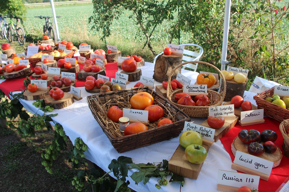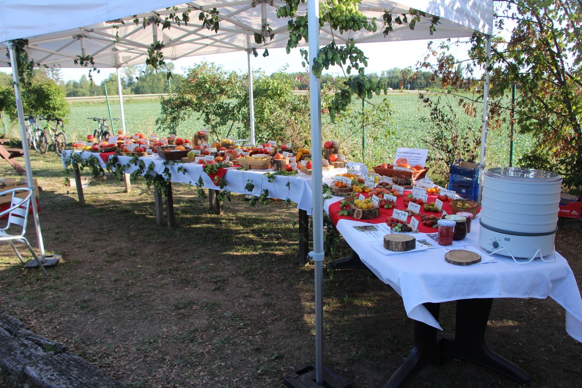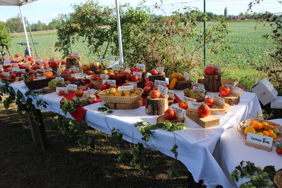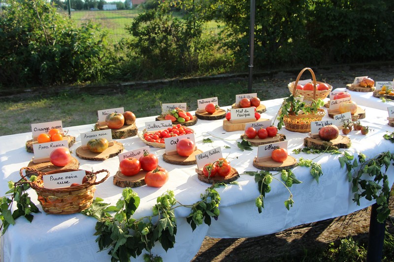 En fin d'après-midi, lorsque s'achève le barbecue et que le soleil décline doucement sur le site de jardins du Galgenfeld, les tomates de l'exposition sont proposées aux jardiniers désireux d'en récupérer les graines afin de diversifier encore leur production l'an prochain. Certaines tomates sont mises de côté pour l'expo au Verger École le lendemain, d'autres pour être proposées à l'ehpad "Dr Oberkirch" où une salade de tomates goûteuses sera préparée par les résidents dès lundi lors de l'atelier culinaire.