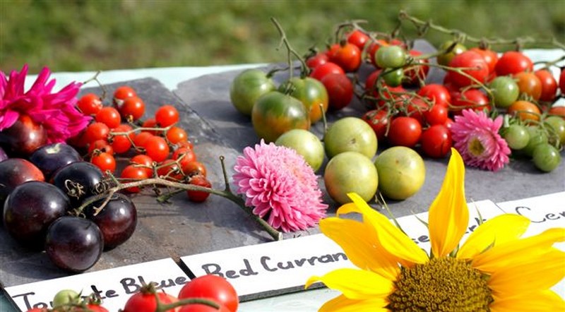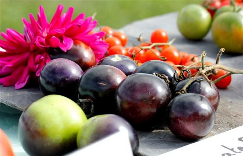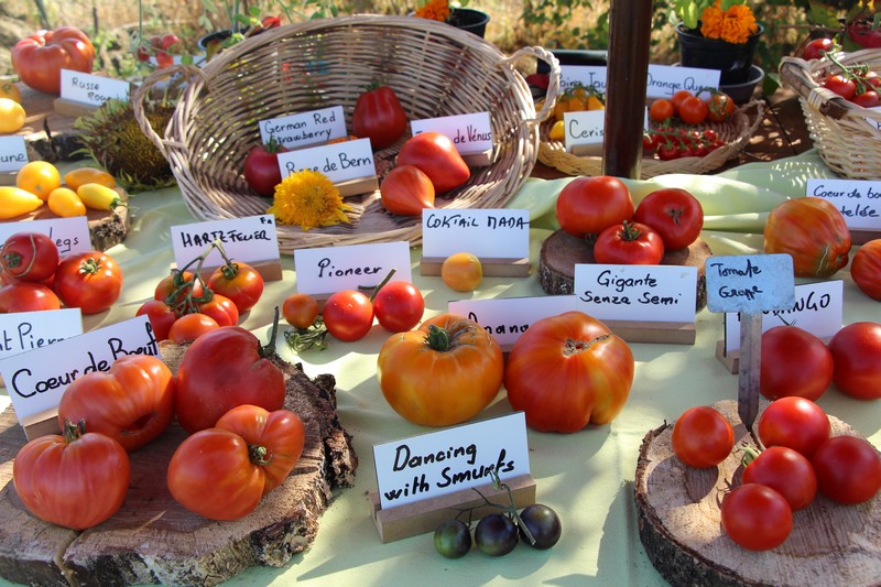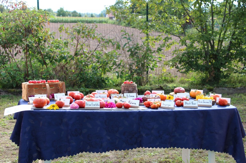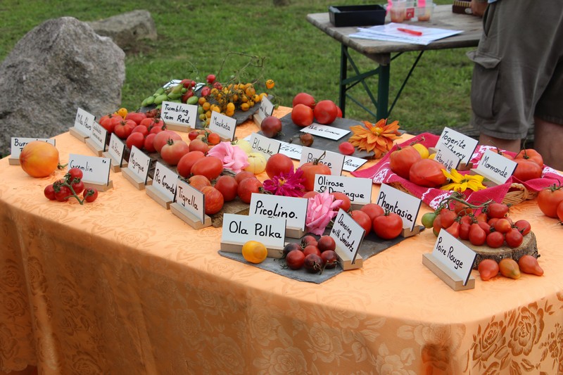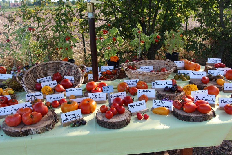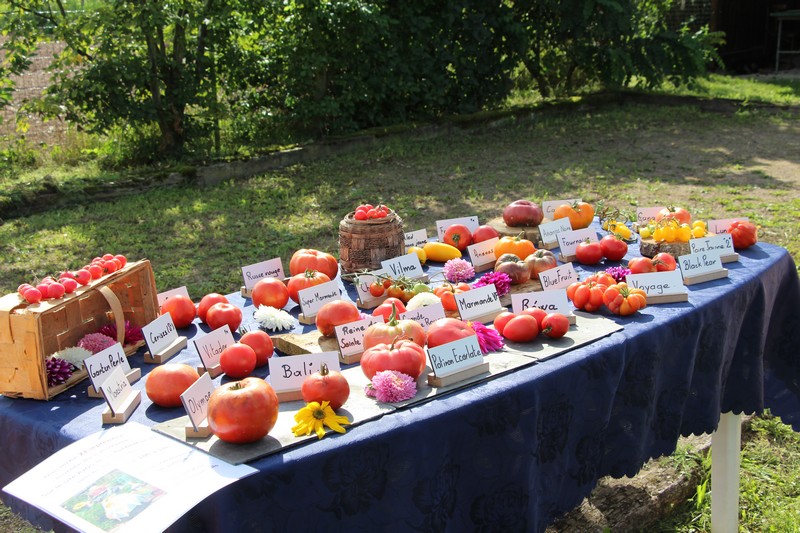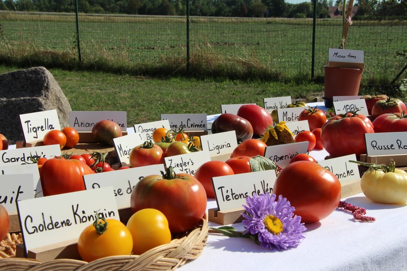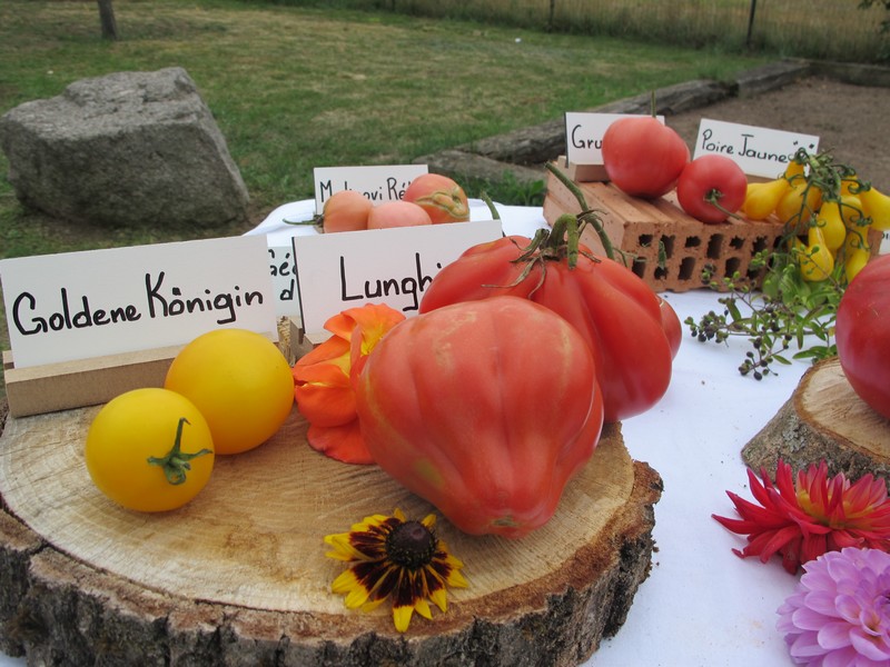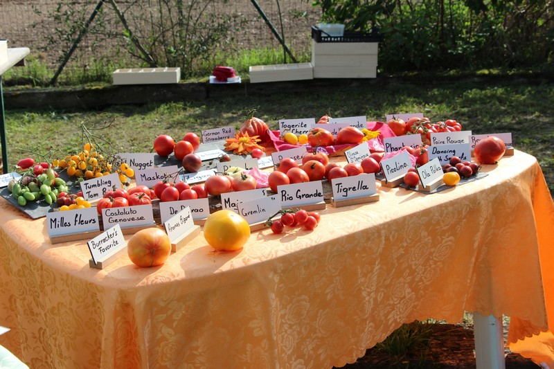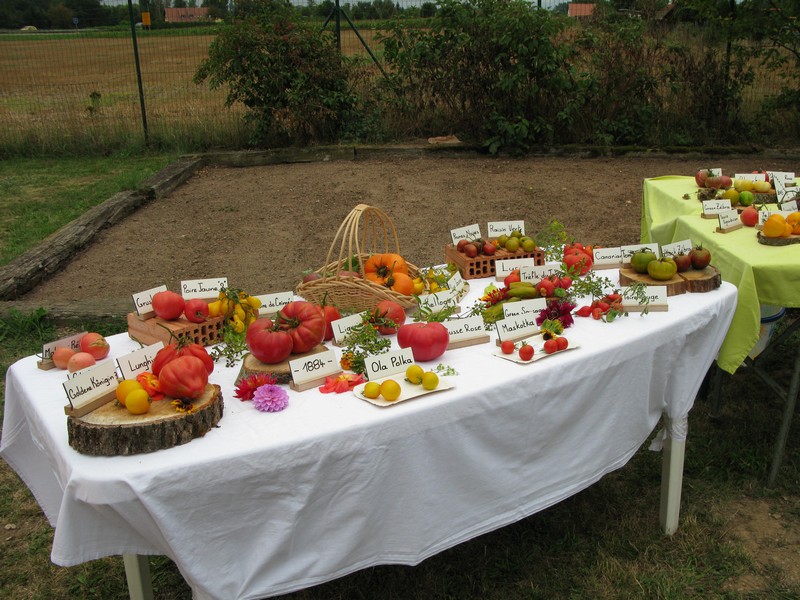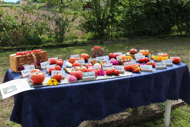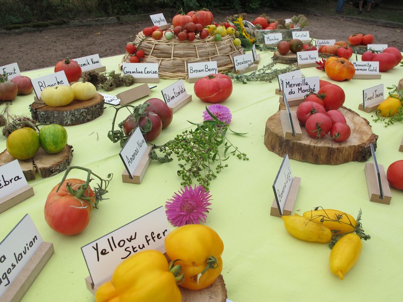 L'exposition de tomates était préparée par Isabelle et Christiane. Un printemps frais a empéché les premiers bouquets de fleurs d'être fécondés, puis vint la sécheresse et surtout la chaleur, nos pieds de tomate ont été soumis à rude épreuve. Les premières tomates ont souvent été récoltées tardivement. Malgré cela nous avons pu exposer quelque 117 variétés cultivées dans les jardins. Certes, les spécimens étaient souvent plus petits qu'à l'habitude et les très grosses tomates de plus de 1kg étaient rares, mais la diversité était là. Quant aux qualités gustatives de chaque variété, elles ont été l'occasion d'échanges entre jardiniers, avant qu'à 19h, les tomates ne soient distribuées pour en recupérer les graines, promesse de belles et savoureuses récoltes à l'été 2020.