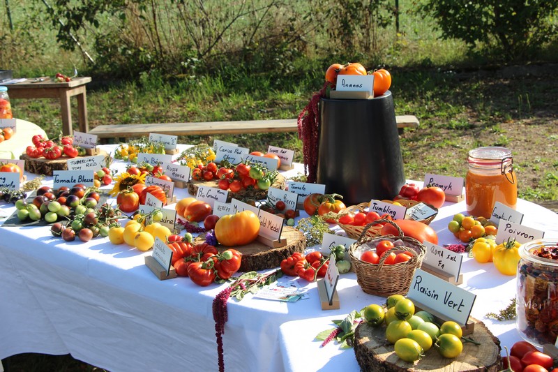 L'exposition de tomates était préparée par Isabelle et Jérôme. Quelque 70 variétés cultivées dans les jardins étaient exposées. De plus de 1,3kg à moins de 20g, verte, orange, noire, rouge bien sûr, et même bleutée, ovale, en poire, en coeur, en téton ... de Vénus ou ronde, c'était un fertival de formes, de tailles et de couleurs. Quant aux qualités gustatives de chaque variété, elles ont été l'occasion d'échanges entre jardiniers, avant qu'à 19h, les tomates ne soient distribuées pour en recupérer la semence, promesse de belles et savoureuses récoltes à l'été 2019.