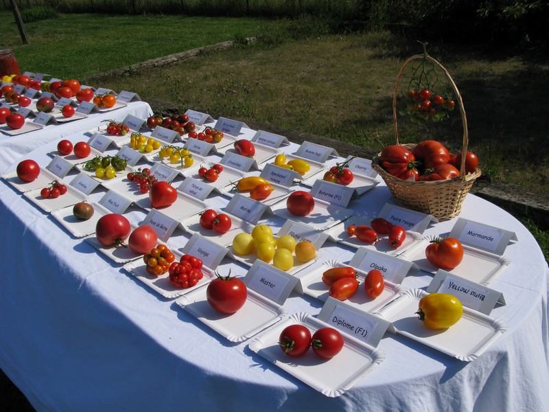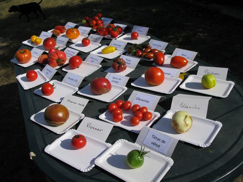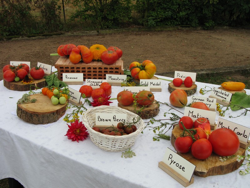 Le 29 août 2015, nous avons organisé une exposition des tomates cultivées par les jardiniers de l'AJOS. Le temps sec et ensoleillé de juillet et août a fait que les tomates étaient saines, contrairement à 2014 ou le mildiou avait anéanti nombre de pieds. Comme à l'accoutumé, Marguerite et Alfred ont monté une superbe exposition réunissant 144 variétés. Ces quelques 144 variétés (certes parfois hybrides) que nous avons collectées dans les jardins de l'AJOS montrent l'importance croissante qu'accordent les jardiniers de l'association à la diversité biologique, puisque qu'en 2014 nous exposions 123 variétés, 94 variétés en 2013 et ... "seulement" 47 variétés en 2010.