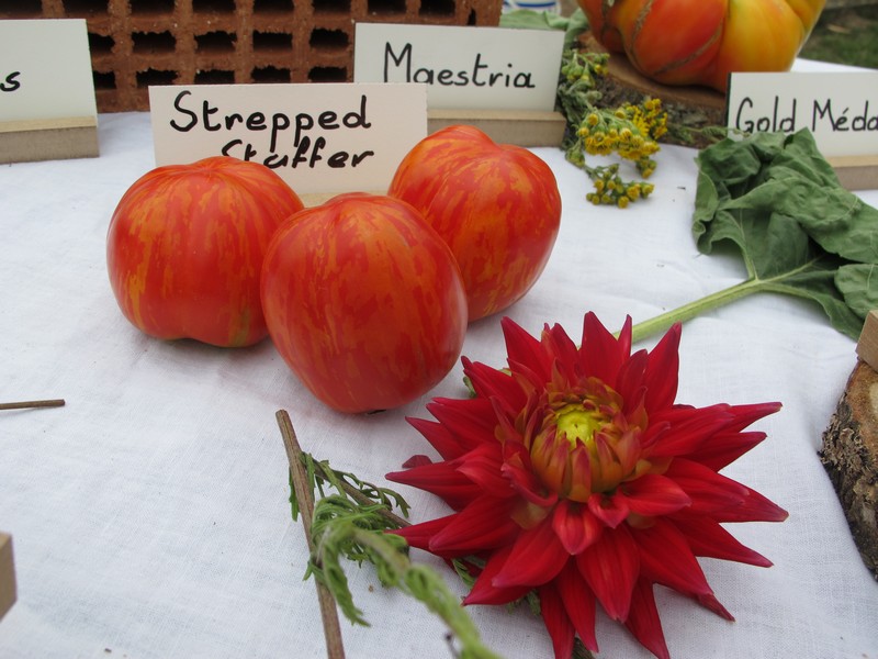 L'exposition a été préparée dès le matin du 2 septembre par Christiane, Isabelle et Patrick. Le printemps et l'été, une nouvelle fois très secs et chauds ont impacté nos récoltes qui ont été précoces. En cette fin d'été les tomates sont de plus petit calibre qu'à l'ordinaire et elles éclatent du fait des récents orages. Les chaleurs intenses et la sécheresse du printemps ont permis à la maladie du cul noir de se développer sur les premiers bouquets. La récolte reste malgré tout très convenable et le mildiou n'a pas pointé le bout de... ses spores. L'exposition proposait 96 variétés identifiées auxquelles s'ajoutaient quelques belles inconnues, parfois cultivées depuis bien longtemps dans nos jardins, telles la Marius de St Lys, la tomate du Ramoneur ou encore la Annette.
