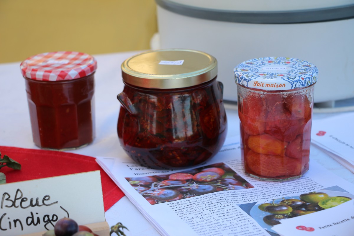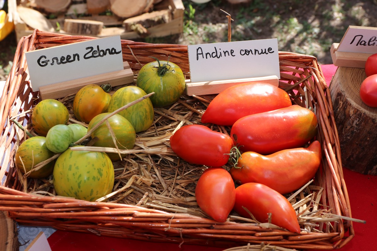 L'exposition de tomates était préparée par Isabelle, Jean-Michel et Patrick. Un printemps très clément, un été chaud et très ensoleillé ont accéléré la production mais avec la sécheresse, il a fallu bien arroser les pieds de tomate pour avoir de beaux fruits et éviter le "cul noir". La pluie tant attendue est arrivée... avec parcimonie la veille de l'expo, perturbant la collecte auprès des jardiniers. Si les spécimens étaient parfois plus petits qu'à l'habitude, de très grosses tomates étaient également exposées, et la diversité était là puisque nous avons pu présenter quelque 105 variétés identifiées et cultivées dans les jardins. Cette année, une place était faite aux "belles inconnues", des tomates non identifiées mais cultivées dans les jardins de l'AJOS depuis parfois plusieurs décennies et évoquant souvent le jardinier l'ayant introduite, telle la "Annette", la "Émile", la "Ramoneur" ou encore la "Maryus de St Lys". Les qualités gustatives de chaque variété ont été l'occasion d'échanges entre jardiniers, avant qu'à 19h, les tomates ne soient distribuées pour en récupérer les graines, promesse de récoltes savoureuses et diversifiées à l'été prochain.