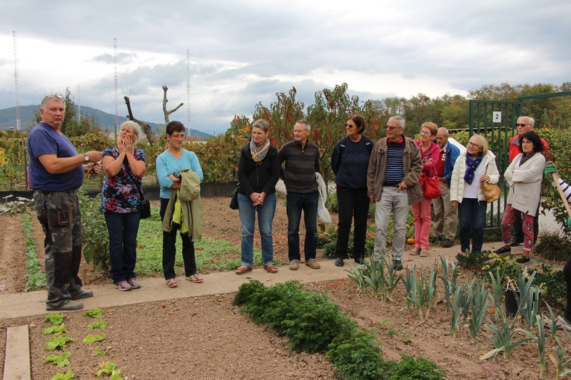 Samedi 30 septembre : Dernière animation jardinage "1h au jardin" de la saison sur le site du Galgenfeld (route de Colmar). L'animation commence par la visite du jardin de Marie et Yves. Yves présente leur grand jardin, superbe et sans la moindre "mauvaise" herbe. De beaux rangs de poireaux, scarole, radis ostergruss, de persil frisé, d'aneth, des planches de moutarde utilisée comme engrais vert, artichauts, asperges ou bluets occupent toute la surface. Marie détaille l'usage qu'elle fait des herbes aromatiques du jardin.