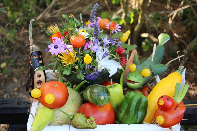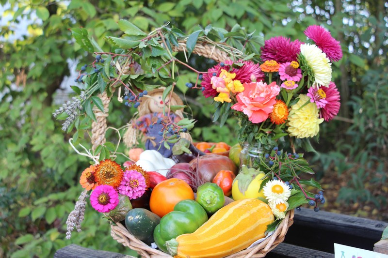 Lundi 18 septembre : Animation "Un bouquet de fleurs du jardin" avec les conseils et l'expertise de Christophe, le fleuriste Sélestadien "Boule de mousse" sur le site du Galgenfeld. L'animation commence par un petit tour dans nos jardins pour y cueillir quelques fleurs, y glaner quelques piments doux, de petites aubergines, une courge butternut ou encore de gros concombres "Empereur Alexandre" à la peau toute craquelée, y couper quelques tiges de romarin, de sauge, un peu de feuillage de vigne, de figuier, de troène, de hêtre et quelques branches mortes.