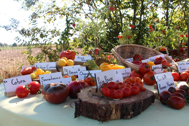 L'exposition a été préparée dès le matin du 2 septembre par Christiane, Isabelle et Patrick. Le printemps et l'été, une nouvelle fois très secs et chauds ont impacté nos récoltes qui ont été précoces. En cette fin d'été les tomates sont de plus petit calibre qu'à l'ordinaire et elles éclatent du fait des récents orages. Les chaleurs intenses et la sécheresse du printemps ont permis à la maladie du cul noir de se développer sur les premiers bouquets. La récolte reste malgré tout très convenable et le mildiou n'a pas pointé le bout de... ses spores. L'exposition proposait 96 variétés identifiées auxquelles s'ajoutaient quelques belles inconnues, parfois cultivées depuis bien longtemps dans nos jardins, telles la Marius de St Lys, la tomate du Ramoneur ou encore la Annette.