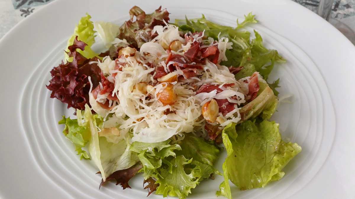Ingrédients (pour 2 personnes) : 100 g de choucroute crue, 50 g de magret fumé coupé en lanières, 1 cuillère à soupe d'huile de noisette, 1 cuillère à soupe de vinaigre de cidre, 1/2 cuillère à café de moutarde (ou raifort), 30 g de noisettes entières, sel et poivre du moulin.