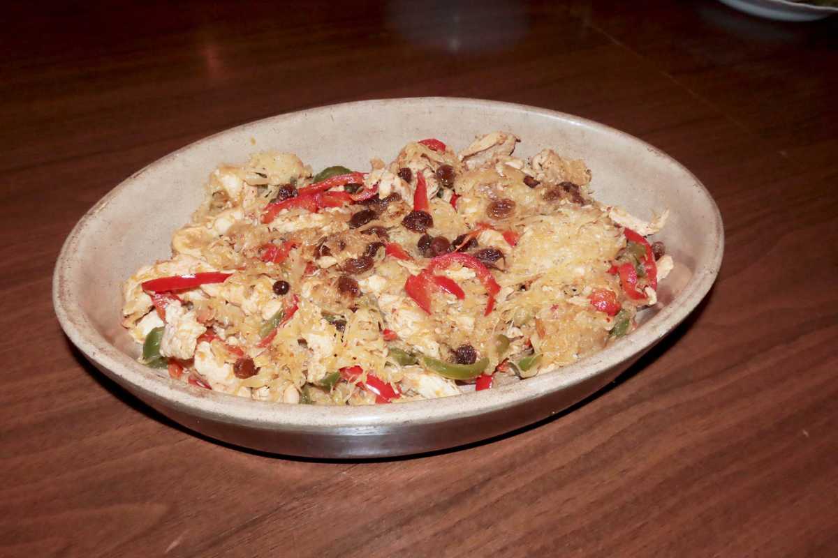 Ingrédients (pour 2 personnes) : 200 g de choucroute cuite, huile pour cuisson, 1/2 poivron rouge , 1/2 poivron vert , 1 gros blanc de volaille (300g), 5 cl de vin blanc , 40 g de raisins secs , ½ cuillère à café de piment d’Espelette, sauce soja , sel et poivre du moulin.