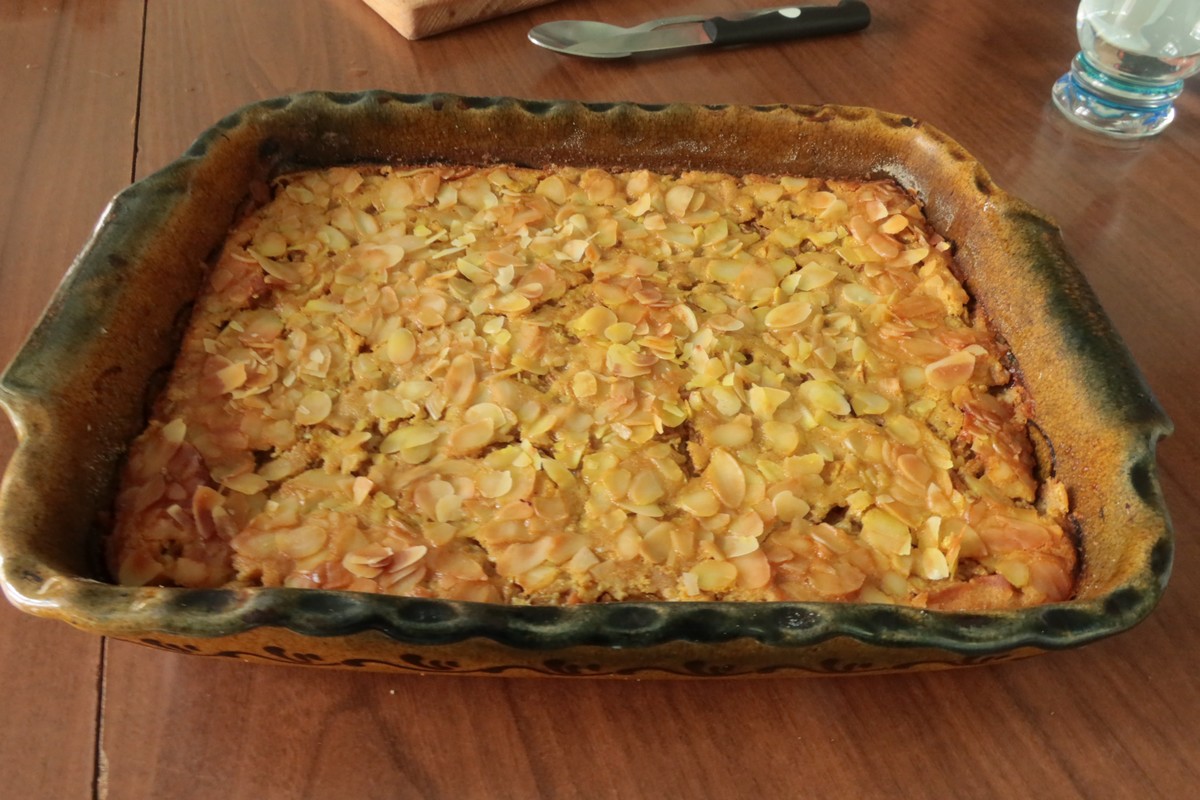 Ingrédients (Pour 6 personnes) : 4-5 pommes et 1 concombre, 30 g de beurre, cannelle et curcuma en poudre, sucre glace, 100 g de farine, 80 g de sucre de canne, 3 œufs, 50cl de lait, 1 cs de crème fraiche, amandes effilées.