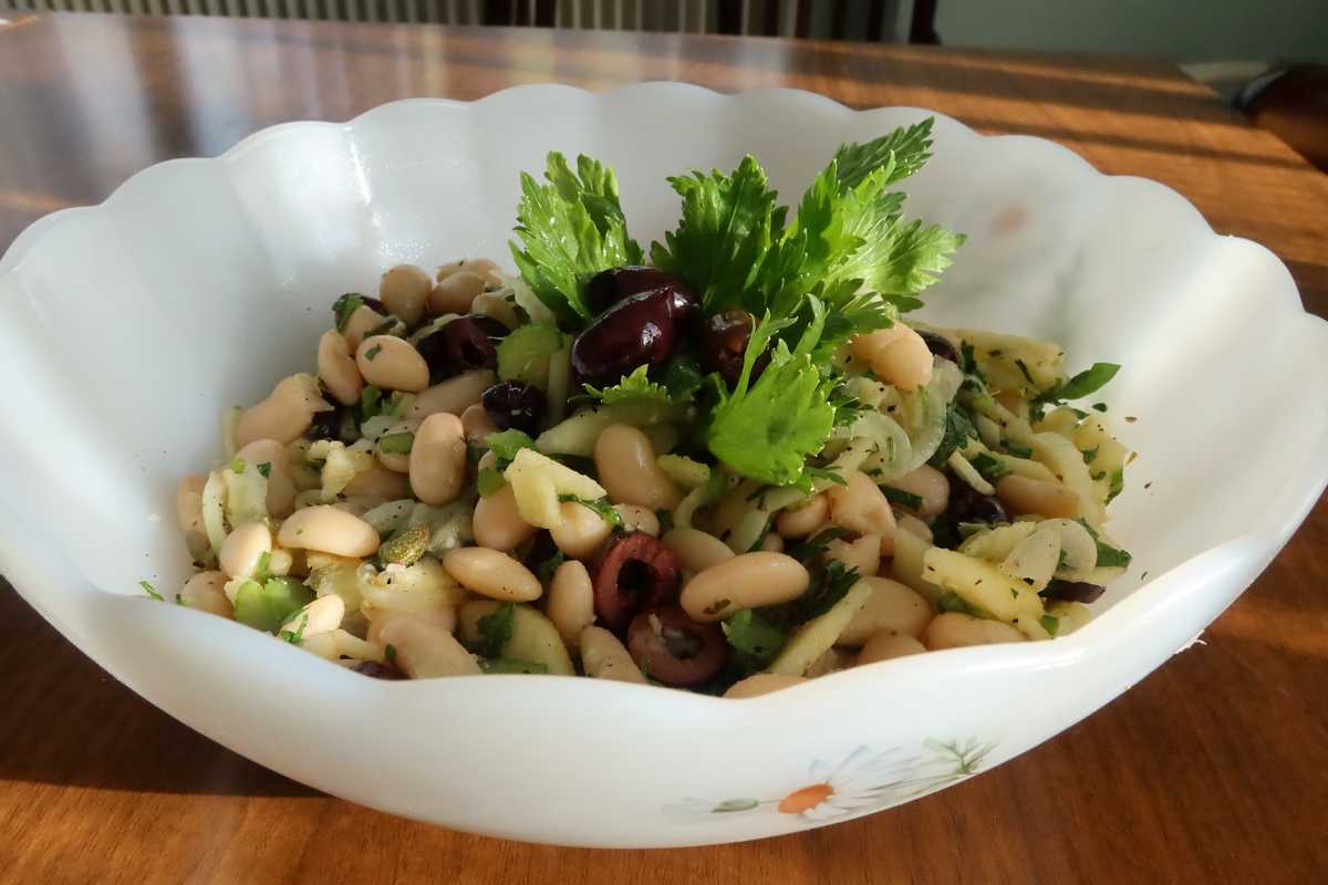 Ingrédients (Pour 4 personnes) : 400g de cocos cuits, 2 petits oignons, 1 branche de céleri, 1 pomme verte, 15 olives noires.