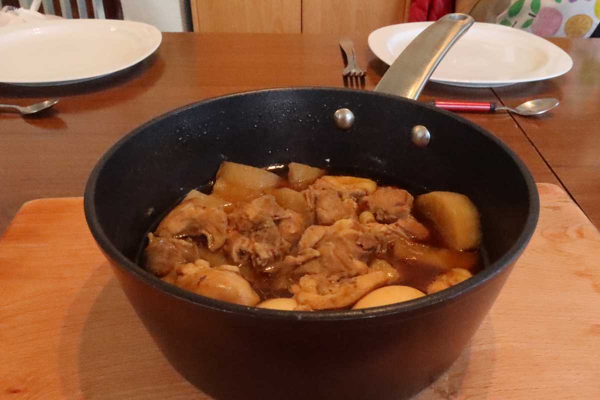 Ingrédients (pour 2 personnes) : 200g de haut de cuisse de poulet, 200g de radis blanc japonais, 1 cs de riz, 2 œufs, 400ml d’eau, 2 cc de granules de dashi (bouillon) à la japonaise, 2 cs de sauce soja, 2 cs de Mirin (saké sucré), 1 cs de vin blanc, 1 cs de sucre.