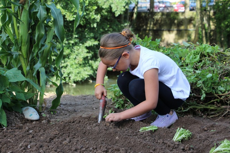 De fin avril à début septembre, 10 enfants âgés de 7 à 10 ans s'arment de binettes, râteaux ou bêches pour embellir le jardin créé sur les pelouses de la médiathèque de Sélestat, en contrebas de la passerelle.
