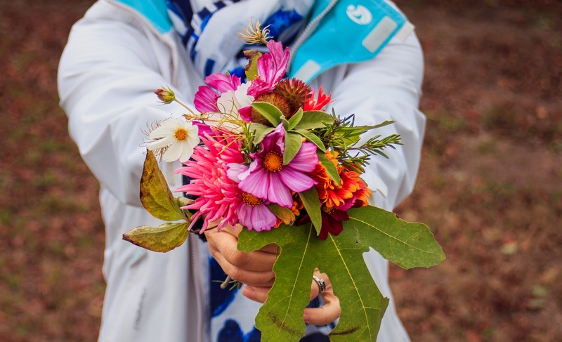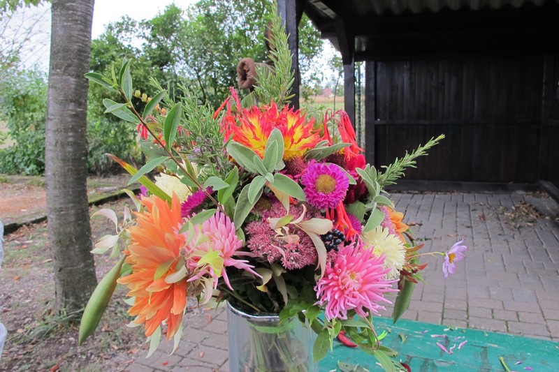 Lundi 18 septembre : Animation "Un bouquet de fleurs du jardin" avec les conseils et l'expertise de Christophe, le fleuriste Sélestadien "Boule de mousse" sur le site du Galgenfeld. L'animation commence par un petit tour dans nos jardins pour y cueillir quelques fleurs, y glaner quelques piments doux, de petites aubergines, une courge butternut ou encore de gros concombres "Empereur Alexandre" à la peau toute craquelée, y couper quelques tiges de romarin, de sauge, un peu de feuillage de vigne, de figuier, de troène, de hêtre et quelques branches mortes.