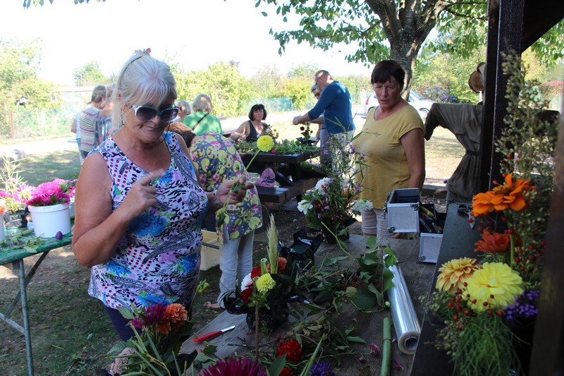 Tous les éléments cueillis viennent rejoindre les fleurs de dahlia, roses, verveine, brins de lavande et autres fleurs déjà sur les tables. Christophe donne quelques consignes pour le piquage dans la mousse puis chacune peut exprimer son talent. Les premiers arrangements floraux prennent forme et Christophe prodigue quelques conseils pour les rendre encore plus harmonieux.