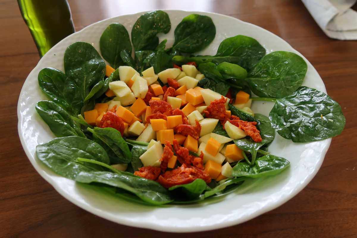 Ingrédients (pour 4 personnes) : 200g de pousses d’épinard, 180g de mimolette, 100g de chorizo, 2 petites pommes, le jus de ½ citron, 3 cs d’huile d'olive, sel et poivre.