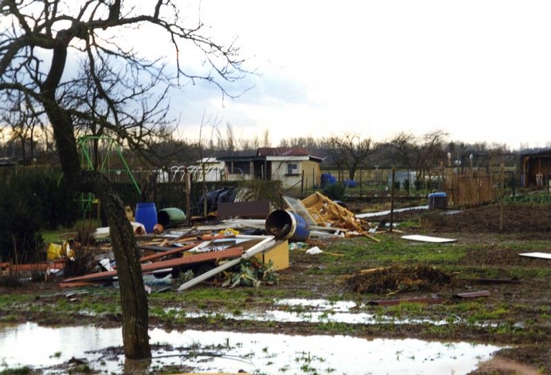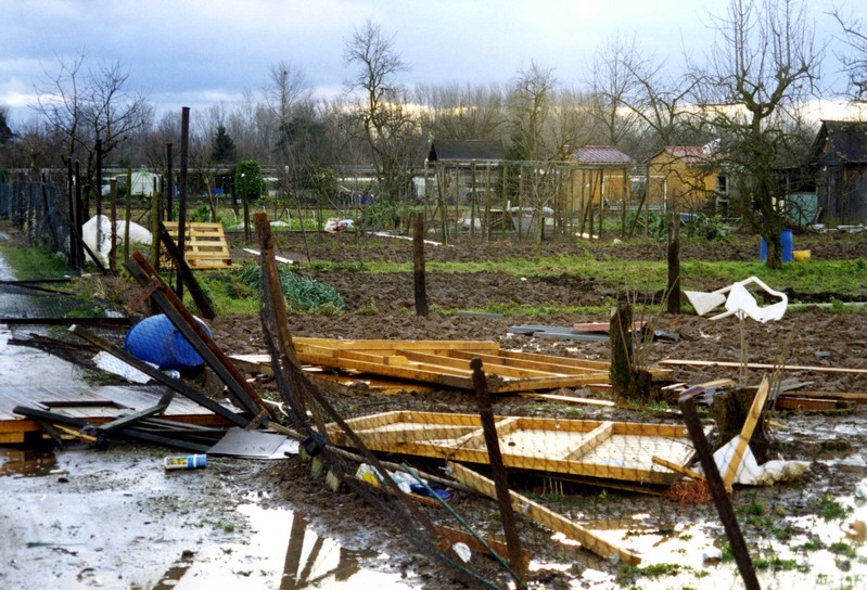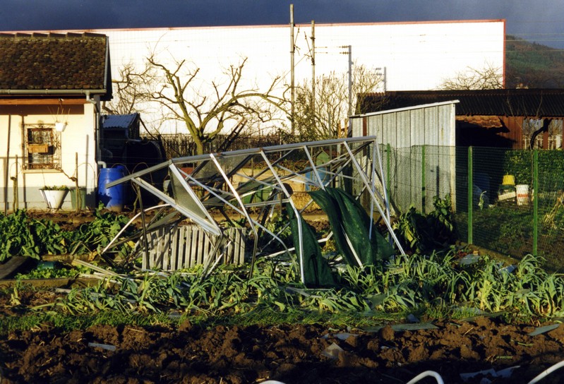 Au matin du 26 décembre 1999, la tempête n’épargne pas les jardins ouvriers. Nombre de jardins ont subi des dégâts. Le site du Galgenfeld est de loin le plus touché.