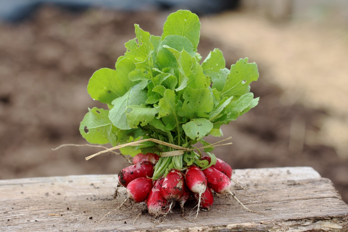 Récolte des dernières feuilles de pissenlit forcé sous tunnel plastique noir. Récolte de laitue feuille de chêne blonde "Kitsch" et de radis "Pernot clair". |