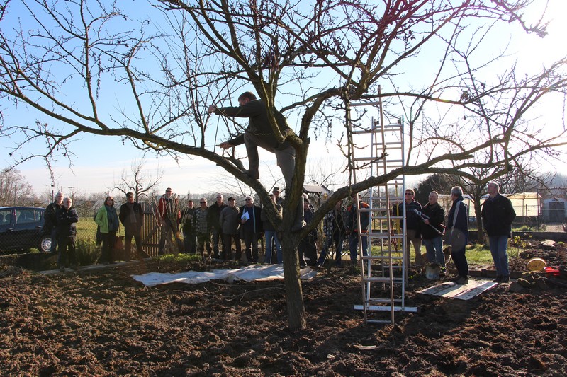 Dimanche 2 mars 2014 : Près d'une trentaine de jardiniers assistaient à ce cours très pratique de Patrick KUNTSLER sur la taille des mirabelliers, quetschers, pêchers, pommiers et poiriers. |