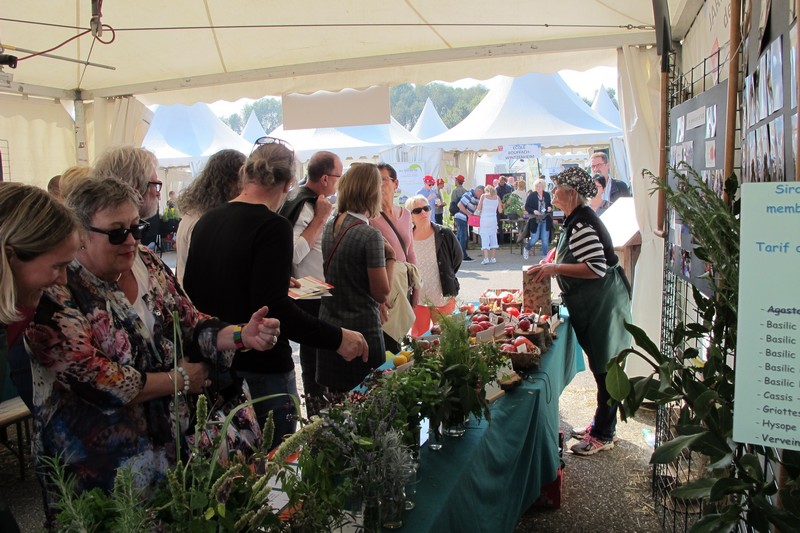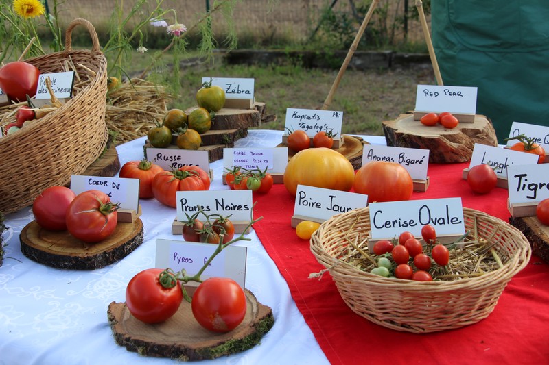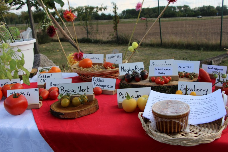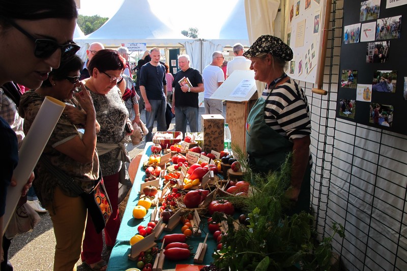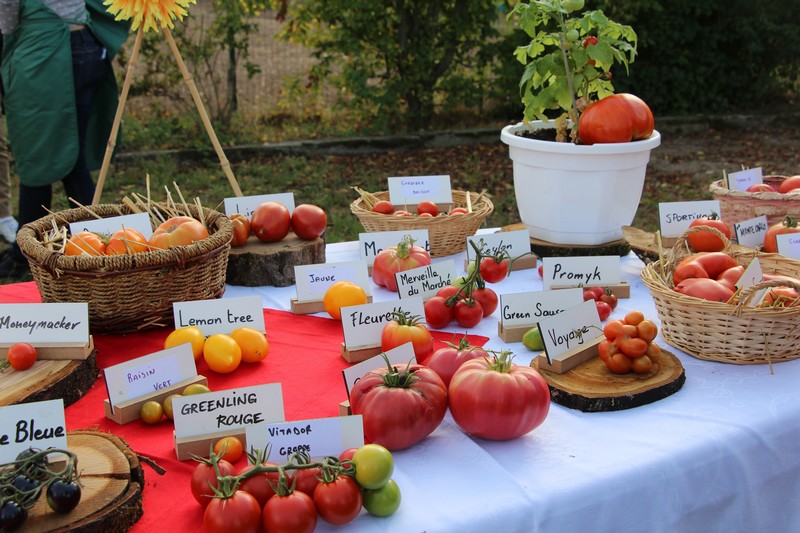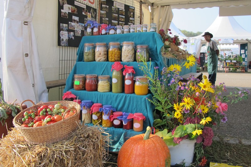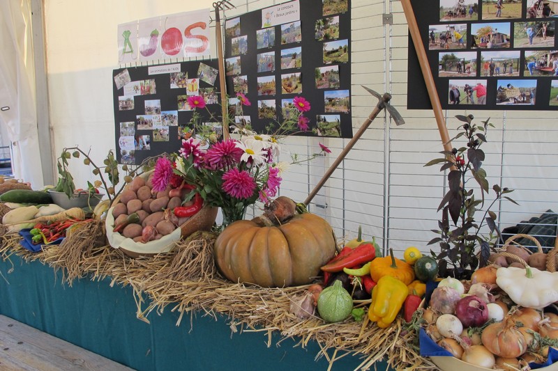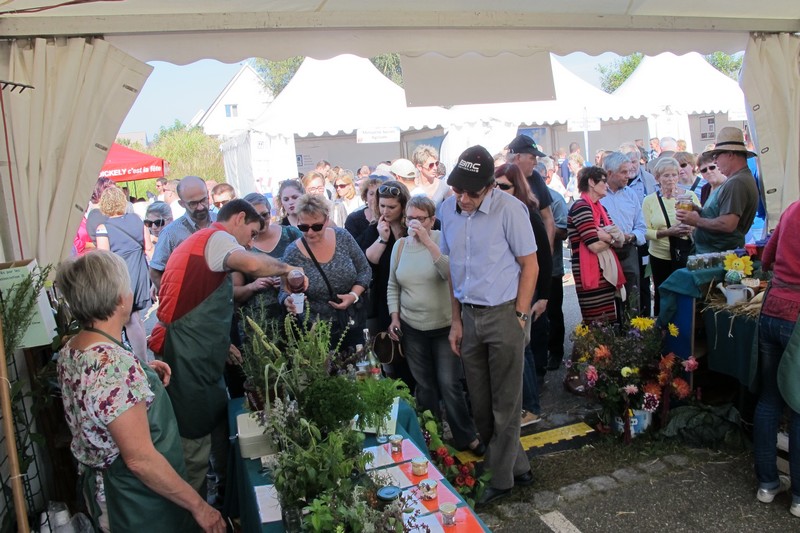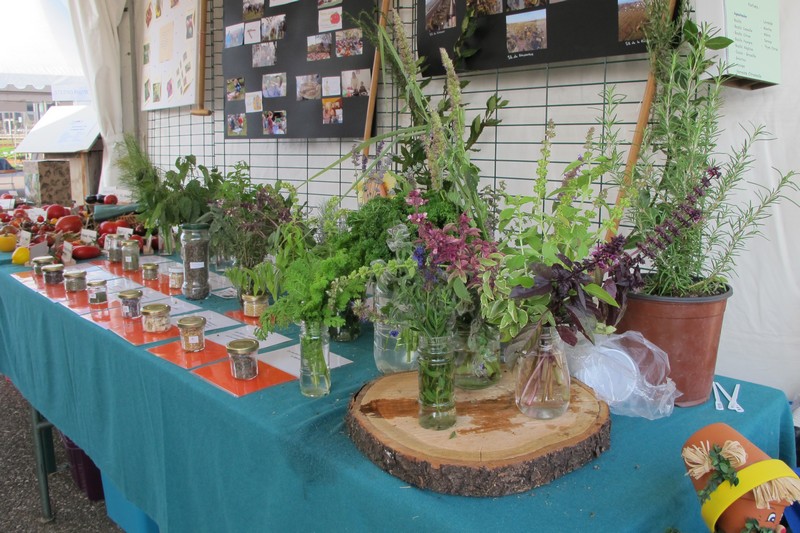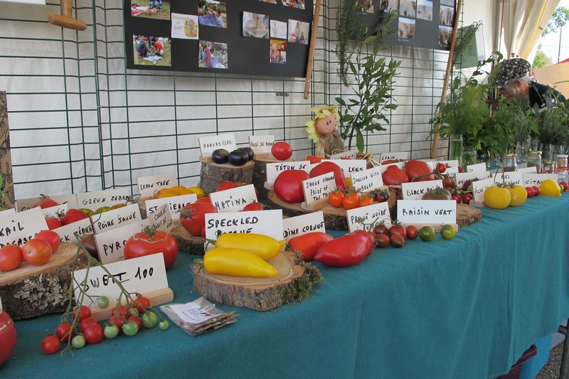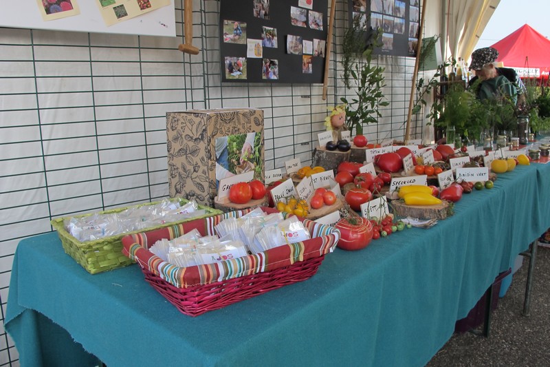 Sur notre stand, pour promouvoir nos jardins, nous présentions des légumes, bien sûr, mais également des herbes aromatiques. Ainsi concombre Empereur Alexandre, concombre citon, concombre asiatique et concombre du Kenya volaient-il la vedette au concombre maraîcher traditionnel, tandis qu'au stand herbes aromatiques les visiteurs étaient invités à excercer leur odorat pour identifier différents basilics, la verveine ou encore la tanaisie crispée. Une exposition de tomates présentant 43 variétés donnait de la couleur au stand et invitait les visiteurs à diversifier leurs plants de tomates en leur proposant des graines. Les papilles gustatives n'étaient pas oubliées, puisqu'étaient proposés, sirops et cocktails sans alcool préparés à partir de plantes du jardin. Le beau temps, un public nombreux et intéressé, des bénévoles motivés pour tenir le stand durant ces 3 jours, tout était là pour un salon réussi.