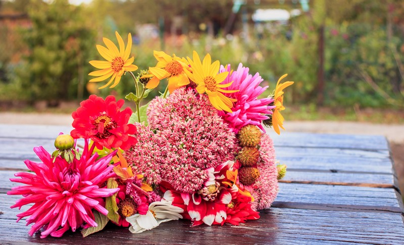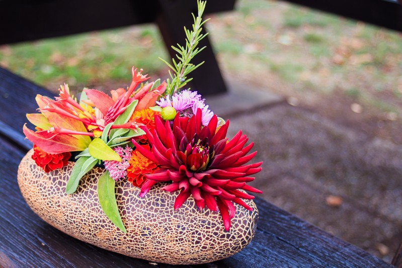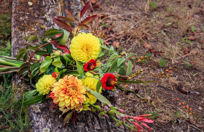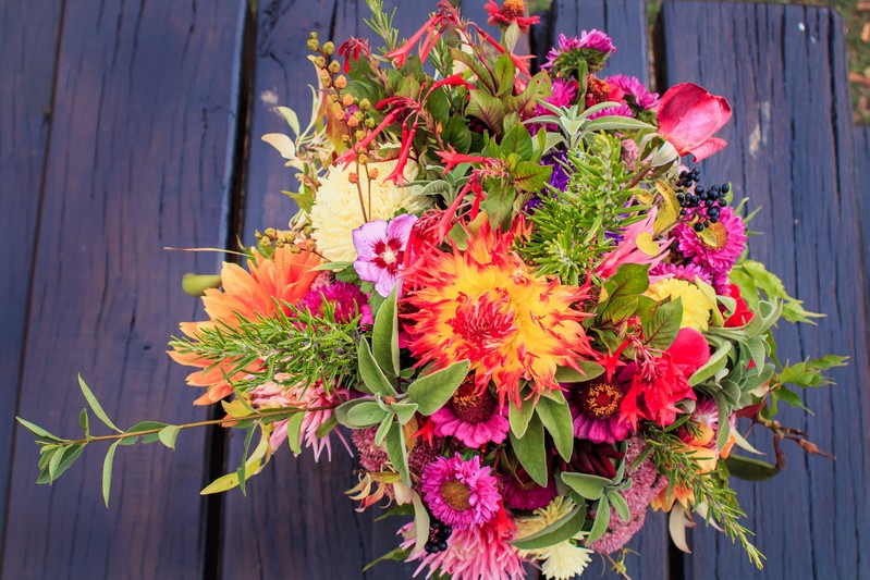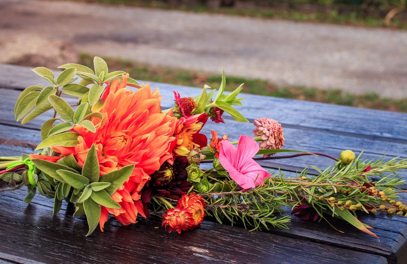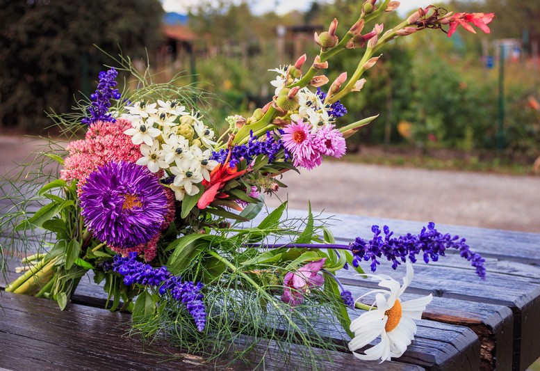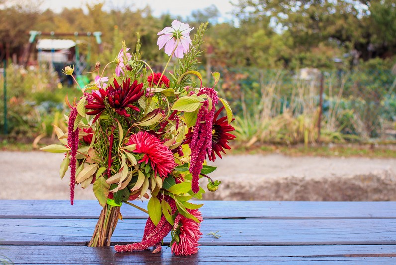 Tous les éléments sont là, en vrac sur la table pour que l'artiste qu'est Christophe exprime son talent. Une tige d'amarante, une autre de romarin, quelques feuilles de figuier, 3 fleurs de zinnia pour la note de couleur, et voilà le premier arrangement qui prend forme. Les bouquets se succèdent, tous différents, et tous splendides. Le tas de fleurs sur la table s'épuise. Reste à se partager les arrangements floraux, à faire quelques photos et à se donner rendez-vous au printemps 2018 pour la confection de nouveaux bouquets