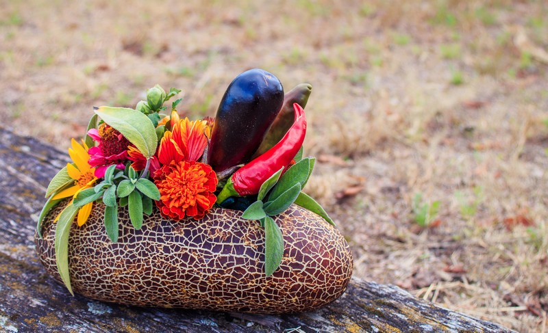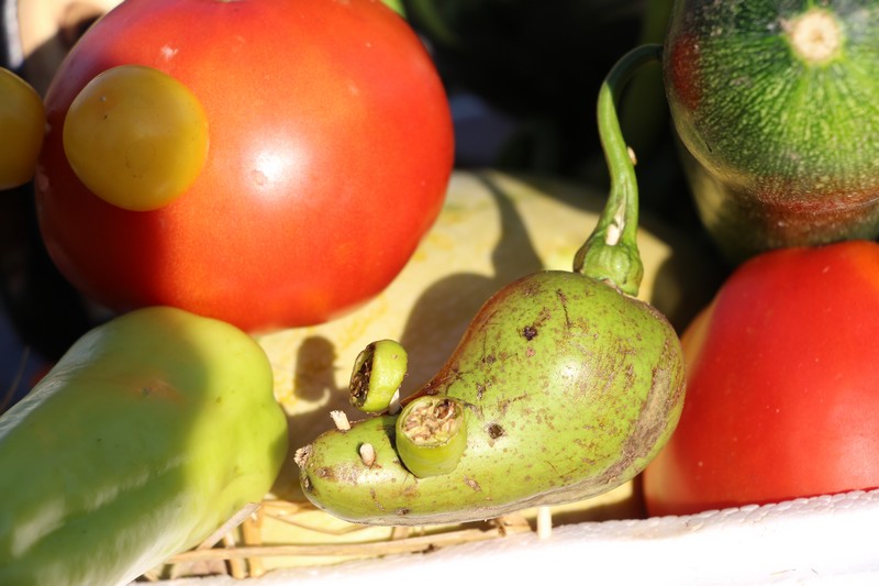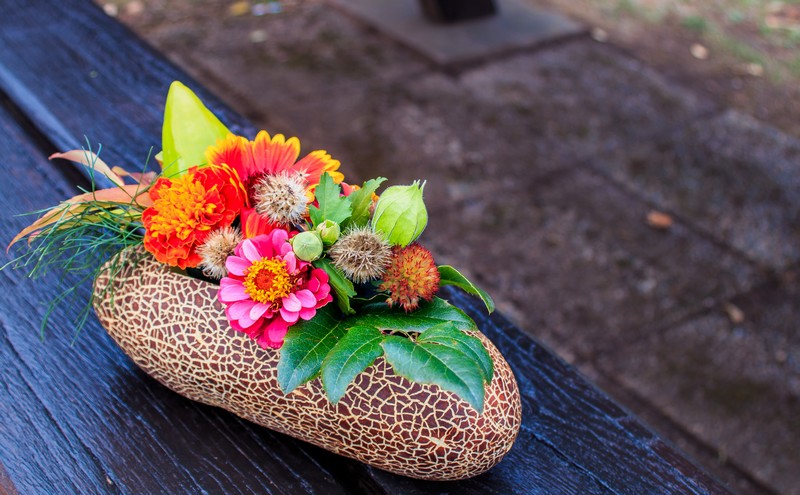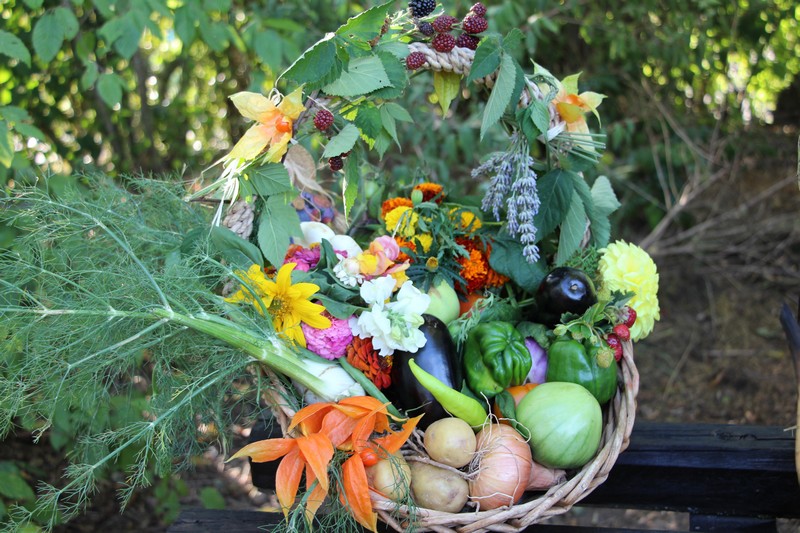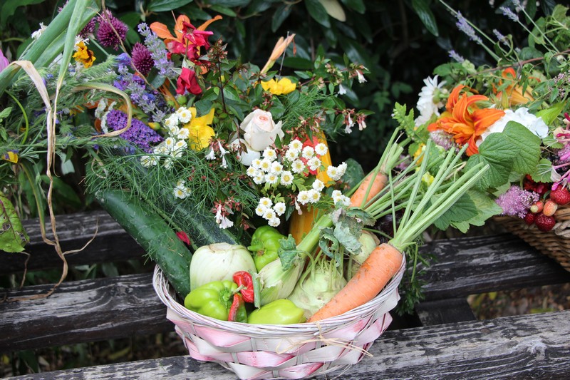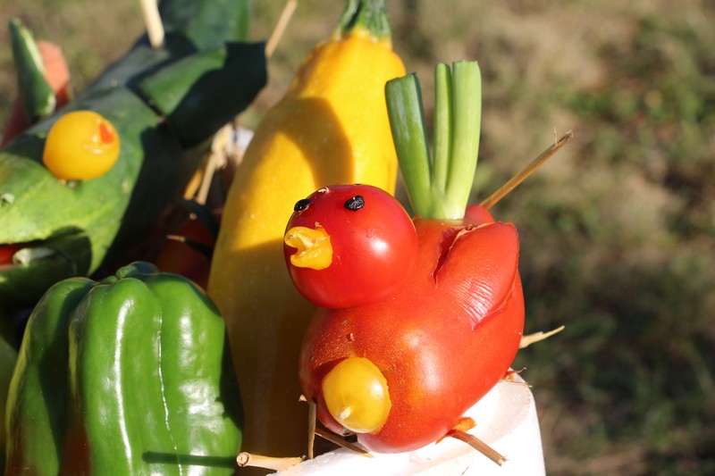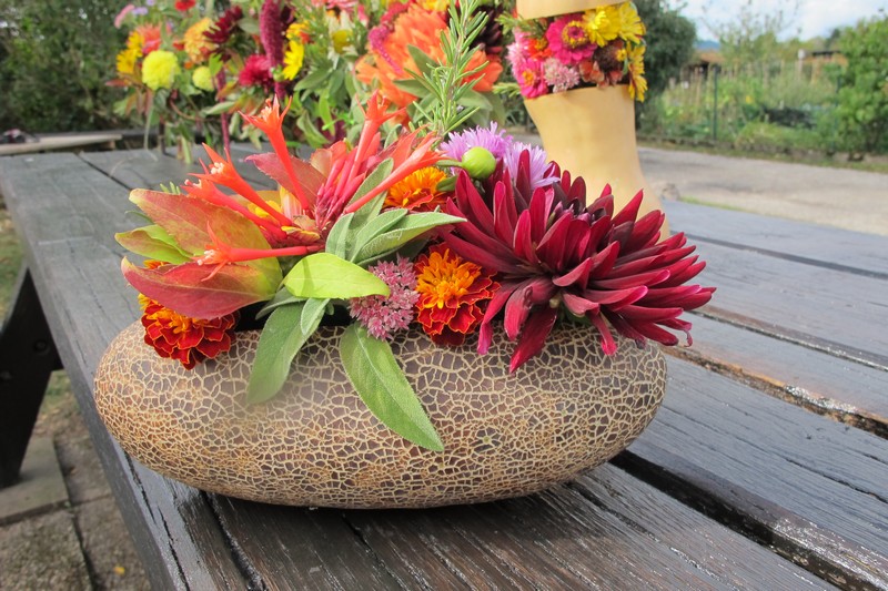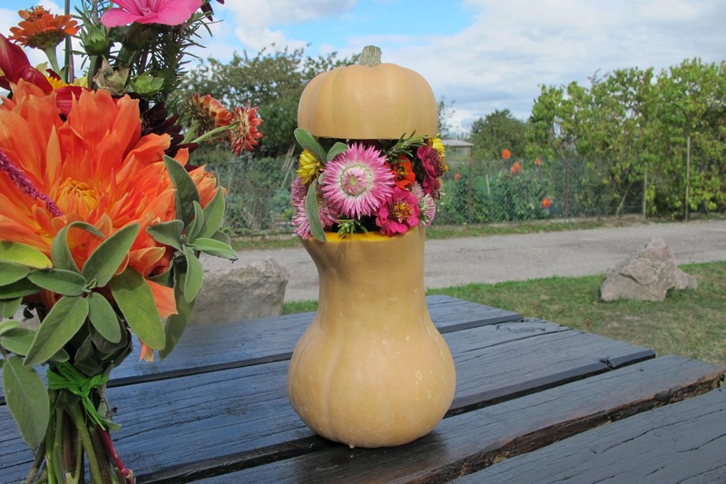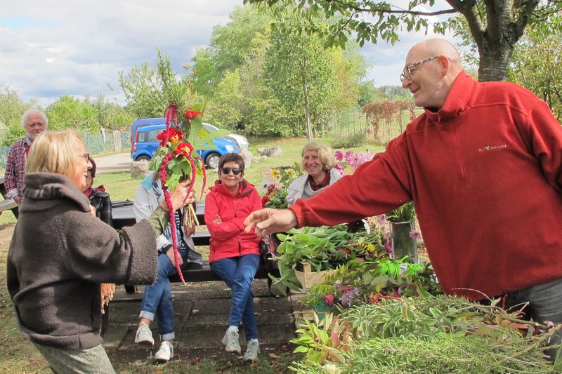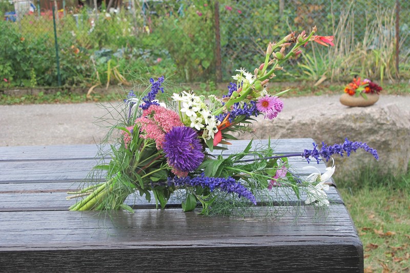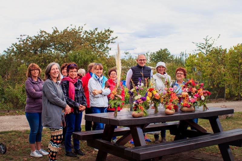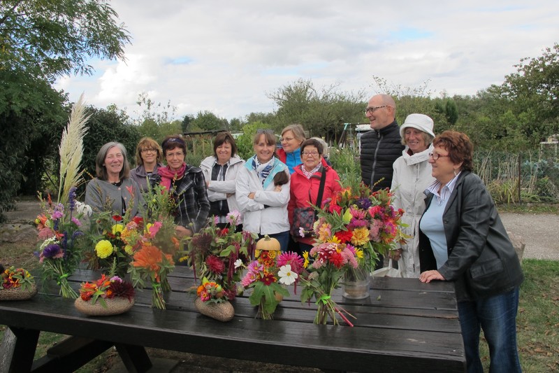 Lundi 18 septembre : Animation "Un bouquet de fleurs du jardin" avec les conseils et l'expertise de Christophe, le fleuriste Sélestadien "Boule de mousse" sur le site du Galgenfeld. L'animation commence par un petit tour dans nos jardins pour y cueillir quelques fleurs, y glaner quelques piments doux, de petites aubergines, une courge butternut ou encore de gros concombres "Empereur Alexandre" à la peau toute craquelée, y couper quelques tiges de romarin, de sauge, un peu de feuillage de vigne, de figuier, de troène, de hêtre et quelques branches mortes.