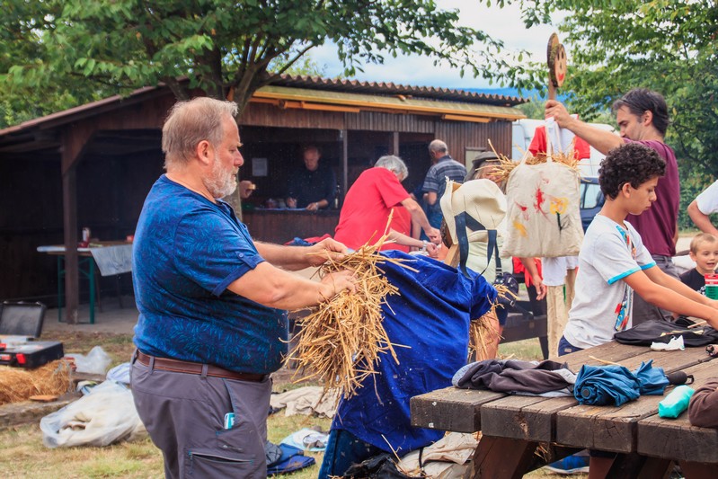 À partir de 15 heures jeunes et … moins jeunes étaient invités à confectionner des épouvantails avec l’aide d’Isabelle, Christiane, Jérôme et Gérard. Vieux chapeaux, chemises hors d’âge, pantalons rapiécés ont donné vie à ces gardiens du potager qui, après l’exposition, ont trouvé leur place dans les jardins de l’AJOS.