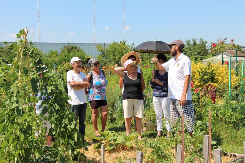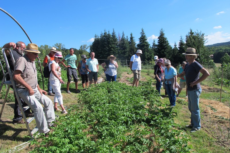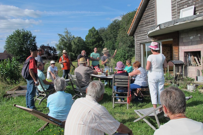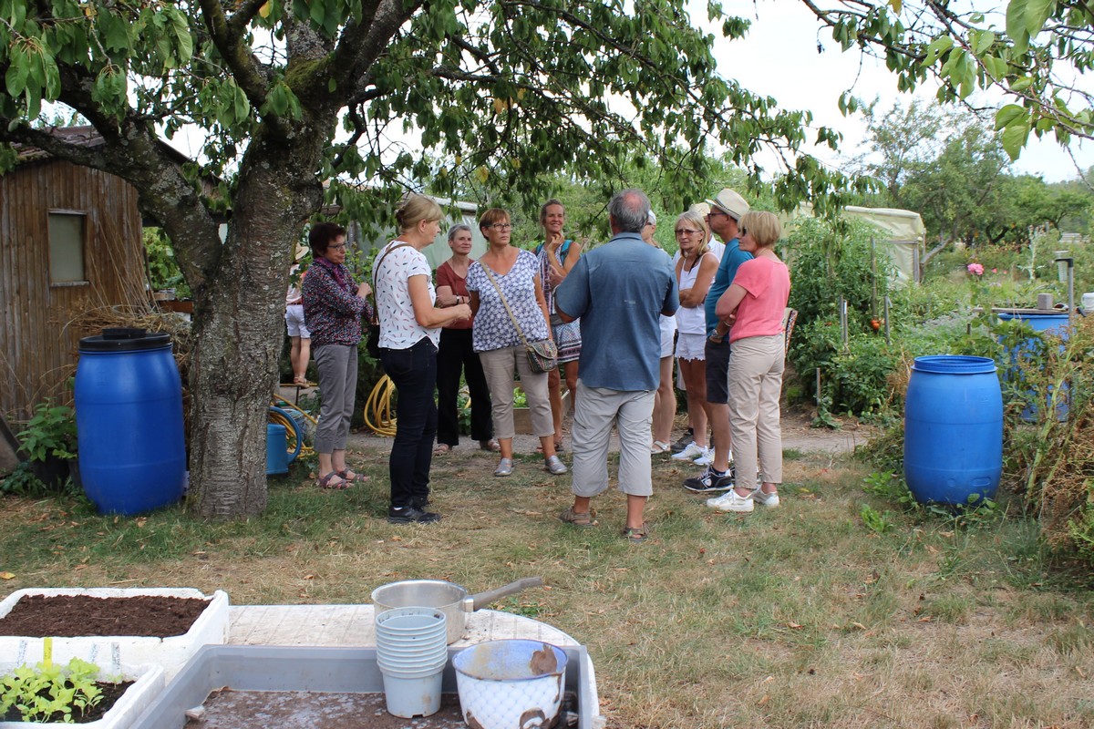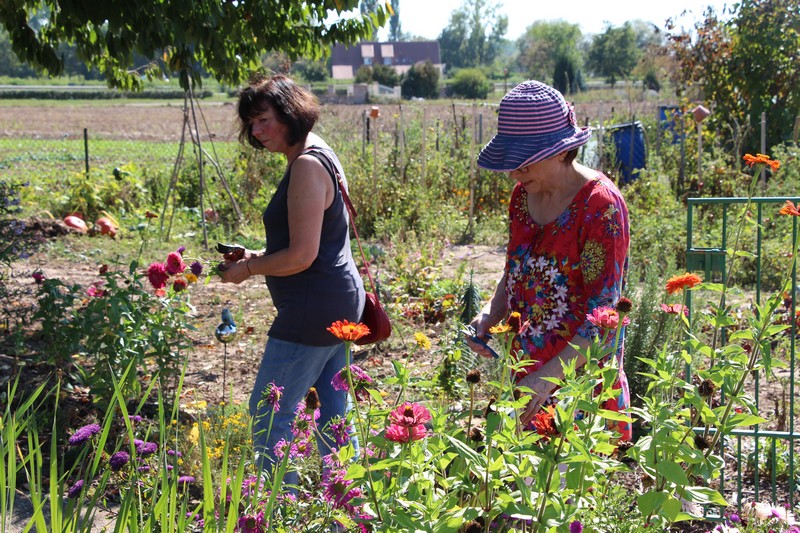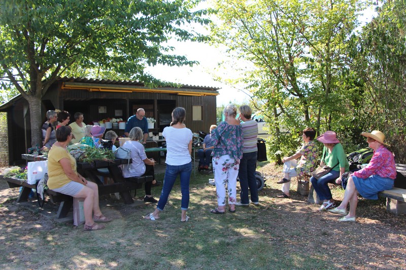 Dès 14h, rendez-vous était donné pour l’animation jardinage « 1h au jardin ». Au programme, la visite de 2 jardins et bien sûr, des conseils de jardinage. Christiane présentait son grand (5 ares) et joli jardin où se côtoient dans une belle harmonie fleurs et superbes légumes. Cosmos, dahlias, zinnias, hibiscus, bégonias, rosiers et passiflore apportaient leurs notes fleuries au jardin et donnaient bel aspect à l’abri au fond du jardin. Coté légumes, tomates, poivrons, piments et aubergines étaient prêts à être cueillis pour confectionner la ratatouille, les pommes de terre terminaient de murir, les haricots donnaient à profusion tandis qu’un joli pied d’artichaut pointait au fond du jardin, ou que poireaux et céleris attendaient l’automne pour être récoltés.