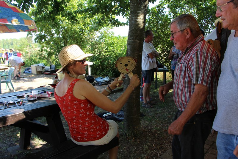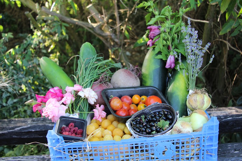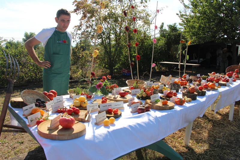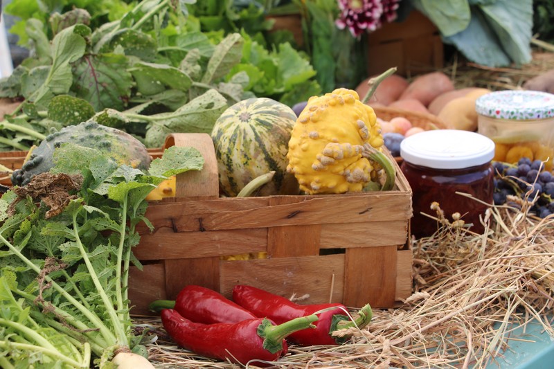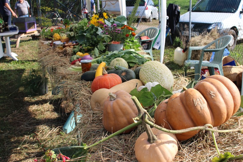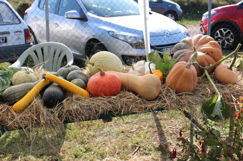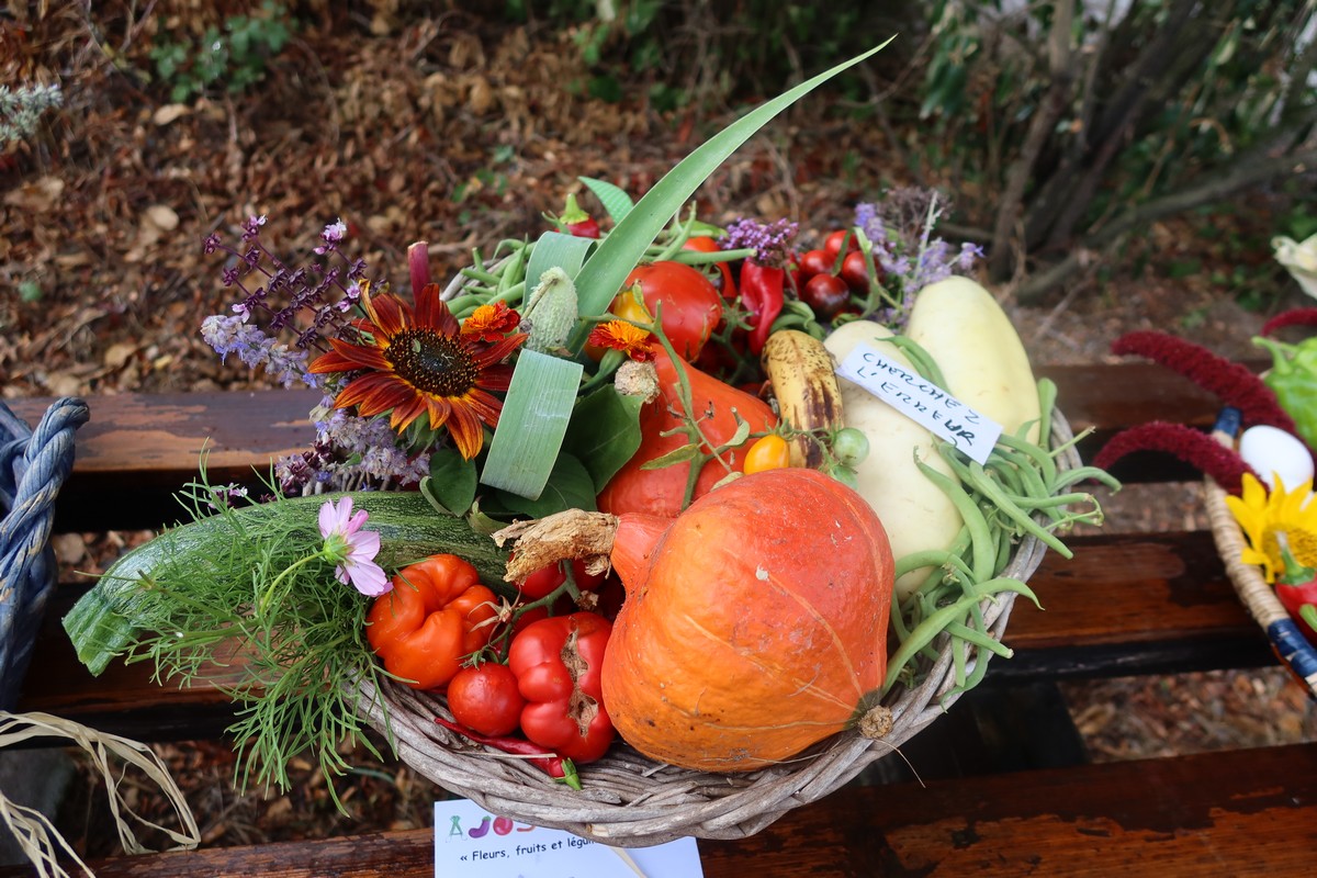 Dans l’après-midi, les jardiniers exposaient leur récolte du jour et concouraient pour l’élection des plus beaux paniers de fruits, fleurs et légumes du jardin. Les conditions climatiques de ce printemps et du début de l’été ayant été très favorables aux cultures dans les potagers, à la condition de passer beaucoup de temps à arroser, les paniers étaient riches et variés. Aubergines, courgettes, concombres, poivrons, tomates côtoyaient haricots, carottes, betteraves, pommes de terre, oignons, mirabelles, pommes et melons. Dahlias, zinnias, verveine, glaïeuls et soleils apportaient leurs touches de couleur.