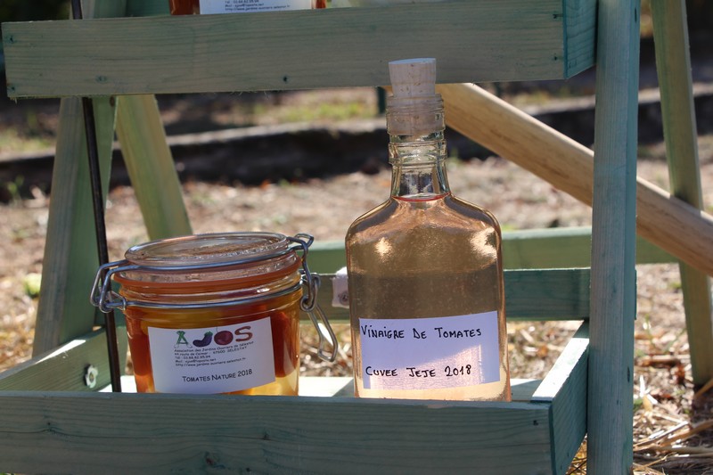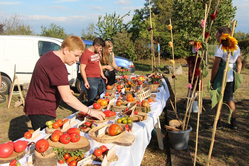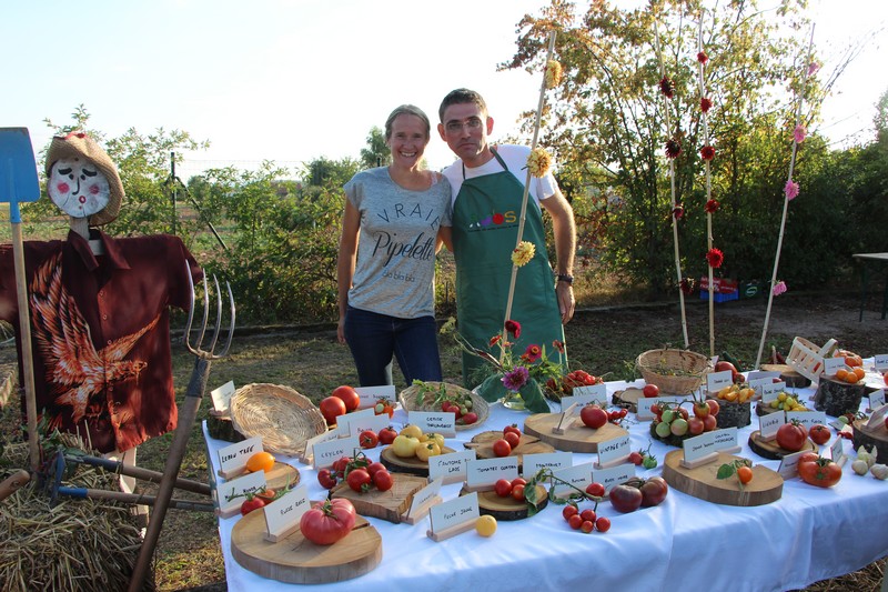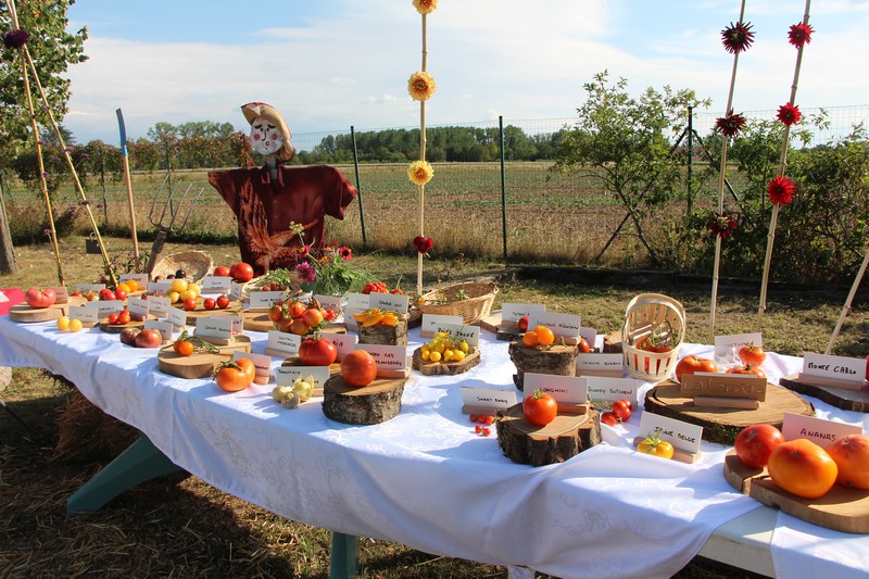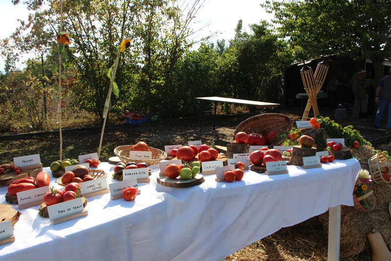 À 15h, l'exposition de tomates préparée par Isabelle et Jérôme était prête. Quelque 70 variétés cultivées dans les jardins étaient exposées. Tomates de plus de 1,3kg à moins de 20g, verte, orange, noire, rouge bien sûr, et même bleutée, ovale, en poire, en cœur, en téton ... de Vénus ou ronde, offraient un festival de formes, de tailles et de couleurs. Quant aux qualités gustatives de chaque variété, elles ont été l'occasion d'échanges entre jardiniers, avant qu'à 19h, les tomates ne soient distribuées pour en récupérer la semence, promesse de belles et savoureuses récoltes à l'été 2019. Voir la page consacrée à la tomate.