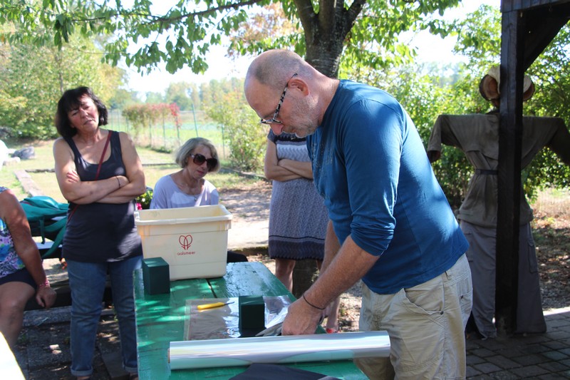 Lundi 17 septembre : Animation "Un bouquet de fleurs du jardin" avec les conseils et l'expertise de Christophe, le fleuriste Sélestadien "Boule de mousse" sur le site du Galgenfeld. Au programme de l'animation : compositions florales par piquage dans des blocs de mousse. Christophe commence par montrer la manière de confectionner les contenants qui seront utilisés : un bloc de mousse entouré de feutrine noire et de papier polypropylène. Tandis qu'il confectionne les 18 contenants nécessaires, commence un petit tour dans nos jardins pour y cueillir quelques fleurs, y glaner quelques herbacées, quelques baies colorées, un peu de feuillage bien vert.