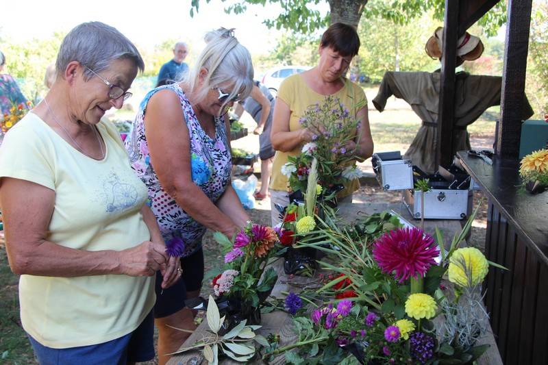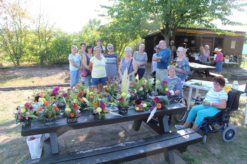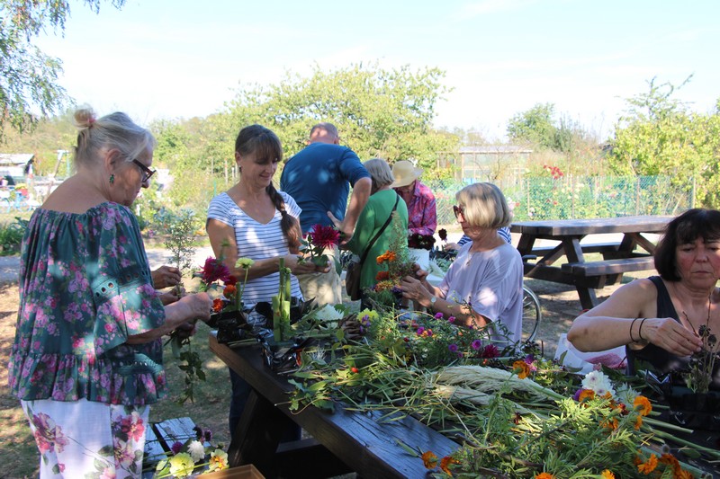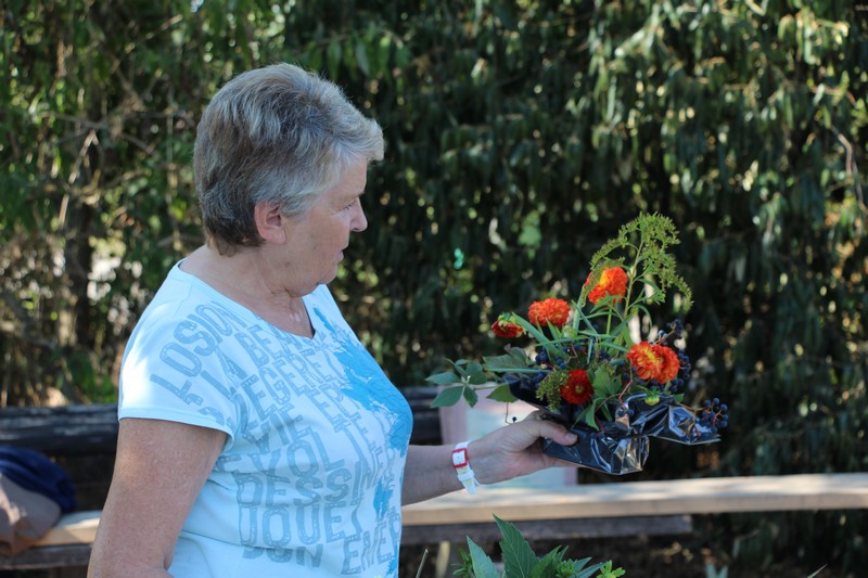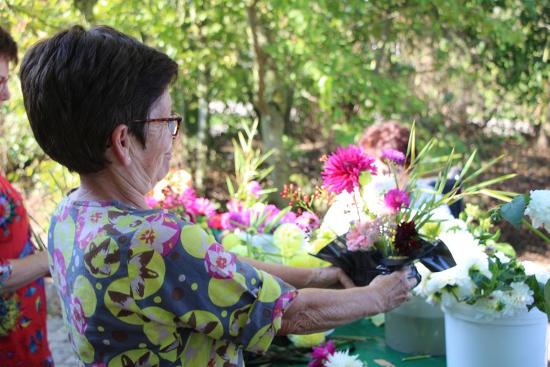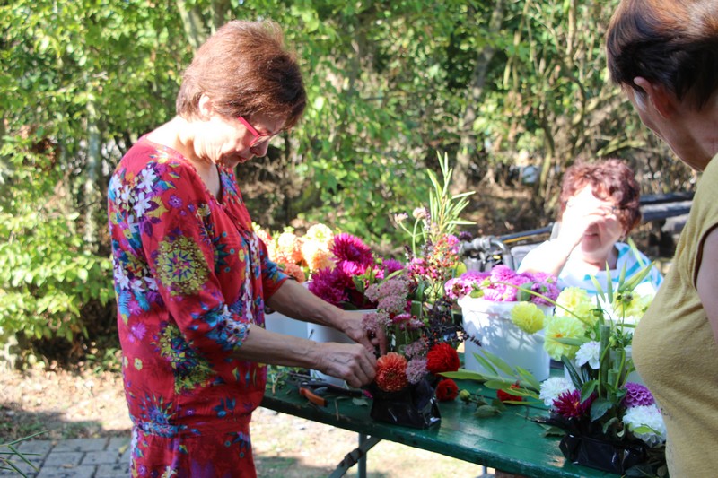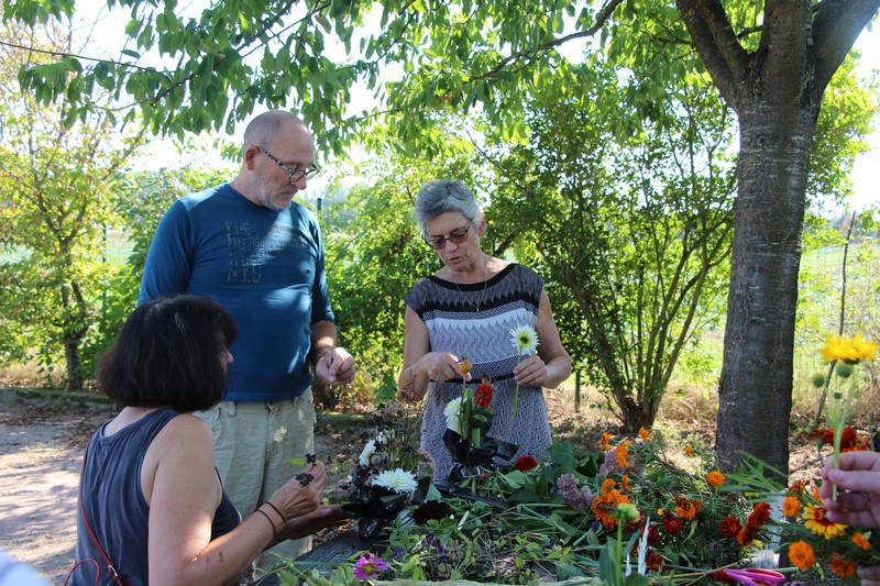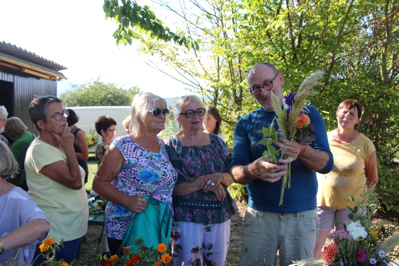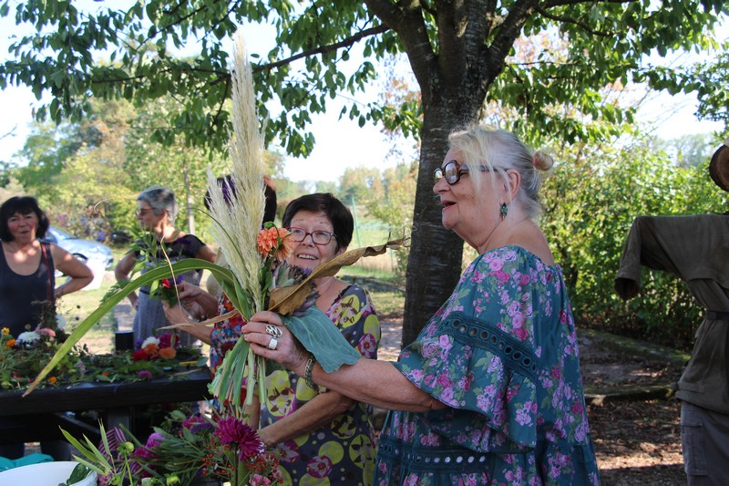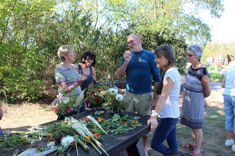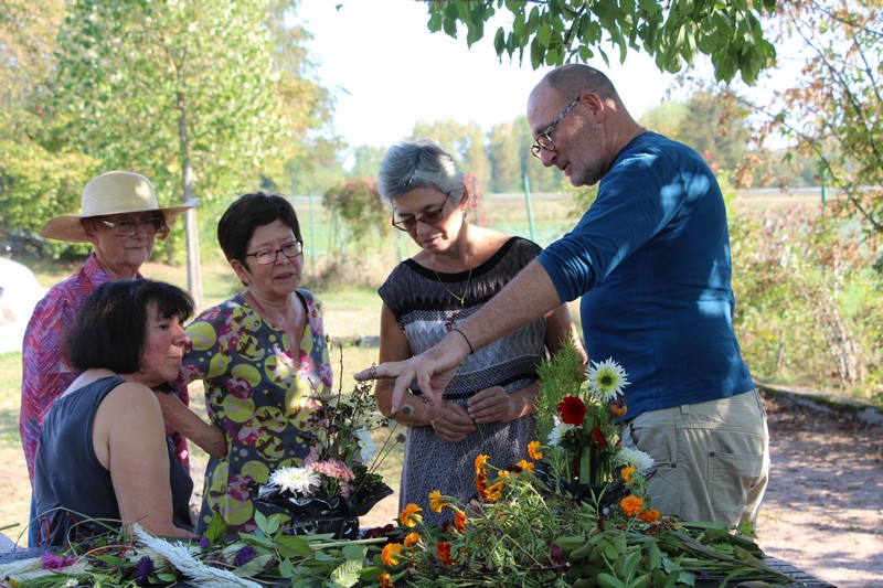 Tous les éléments cueillis viennent rejoindre les fleurs de dahlia, roses, verveine, brins de lavande et autres fleurs déjà sur les tables. Christophe donne quelques consignes pour le piquage dans la mousse puis chacune peut exprimer son talent. Les premiers arrangements floraux prennent forme et Christophe prodigue quelques conseils pour les rendre encore plus harmonieux.