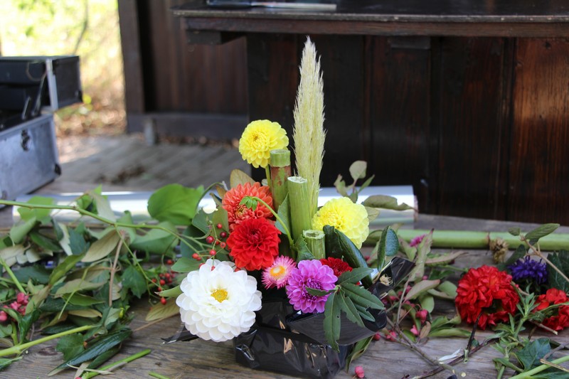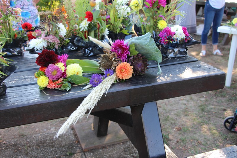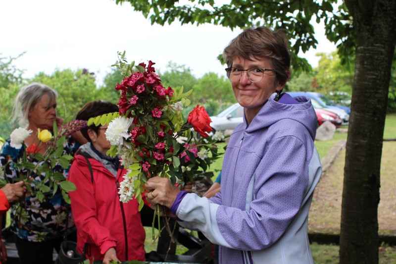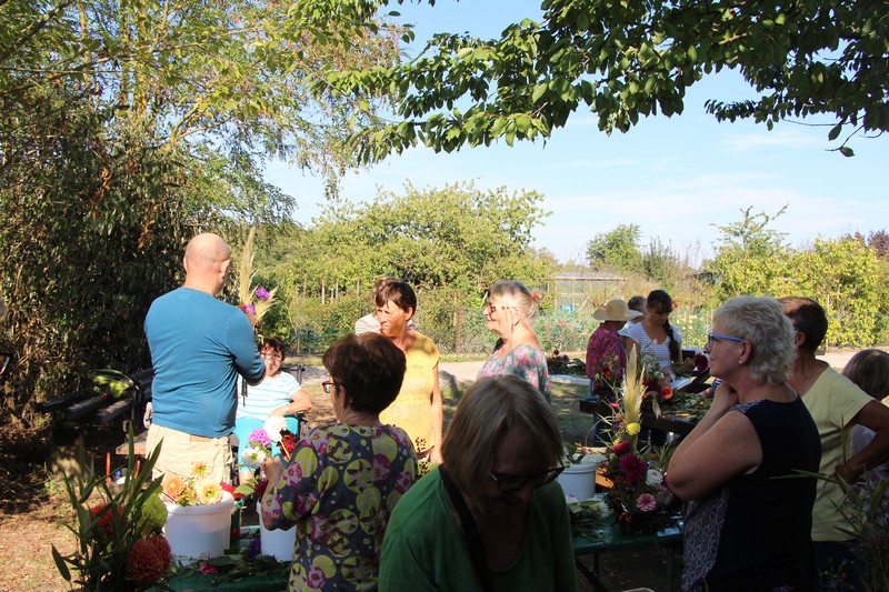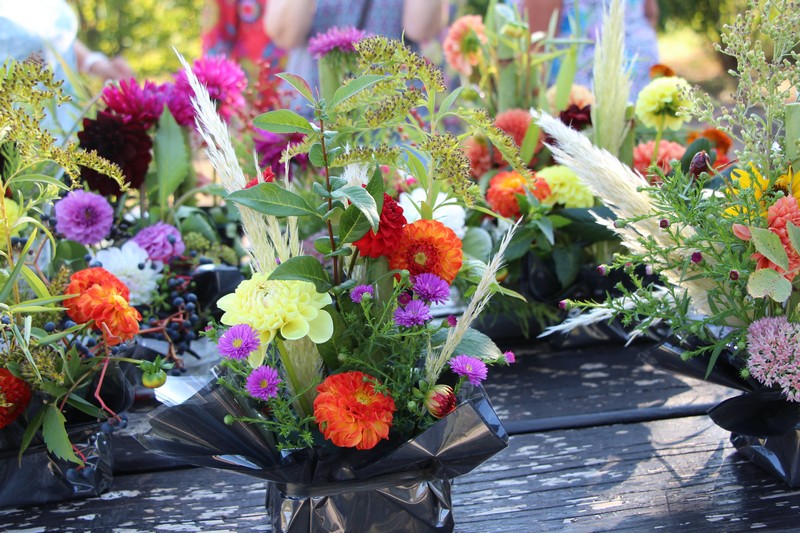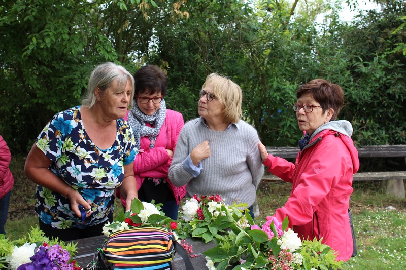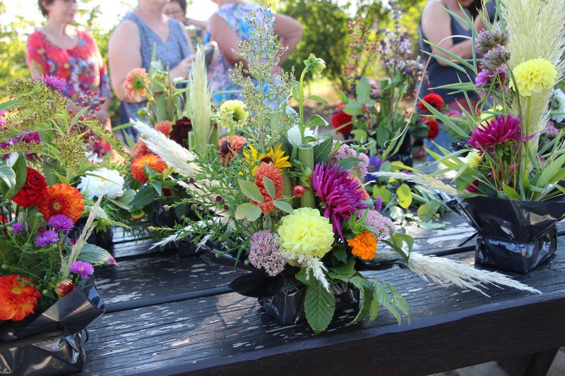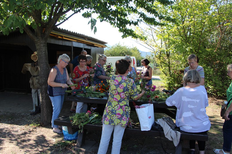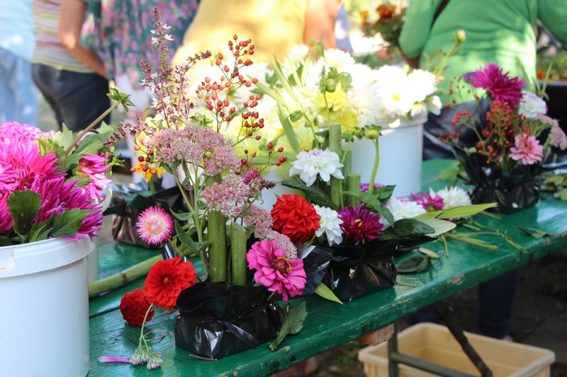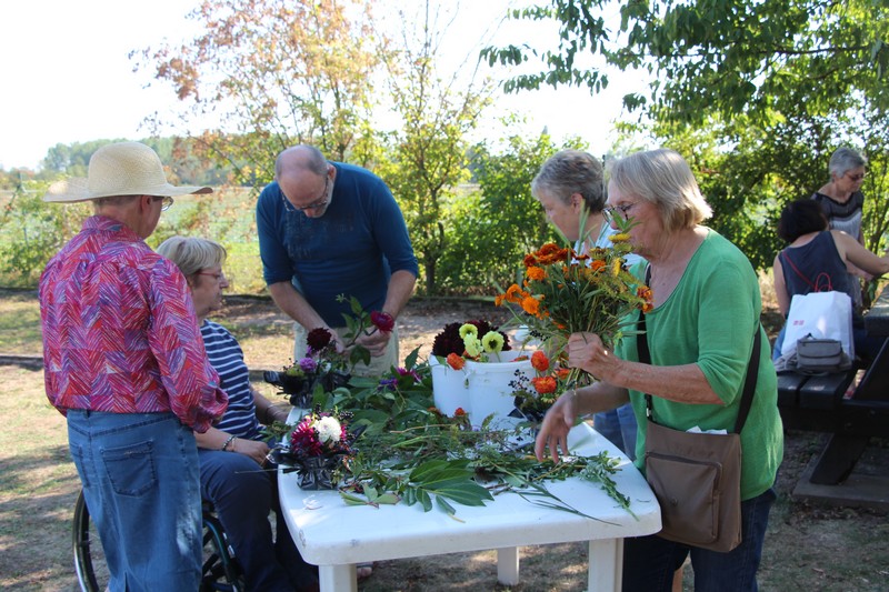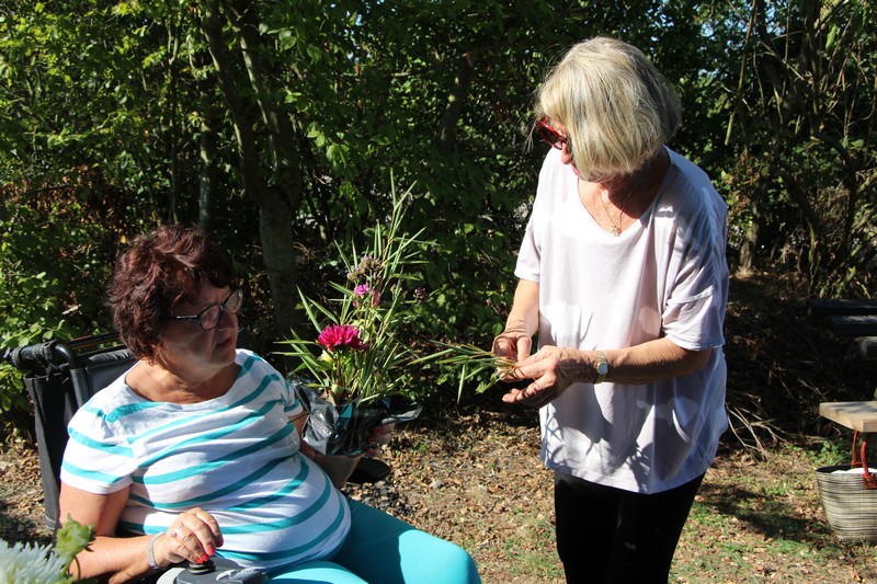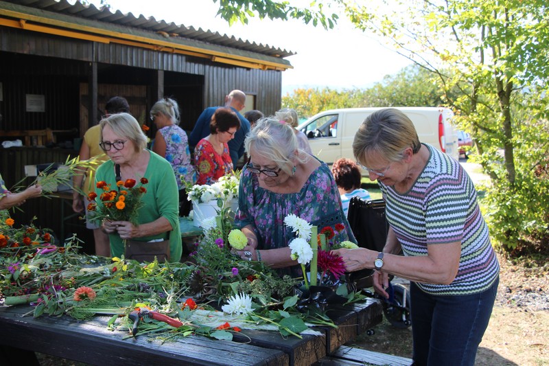 Tous les éléments cueillis viennent rejoindre les fleurs de dahlia, roses, verveine, brins de lavande et autres fleurs déjà sur les tables. Christophe donne quelques consignes pour le piquage dans la mousse puis chacune peut exprimer son talent. Les premiers arrangements floraux prennent forme et Christophe prodigue quelques conseils pour les rendre encore plus harmonieux.