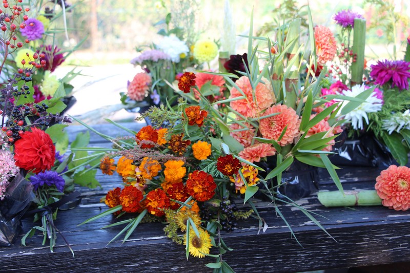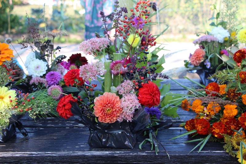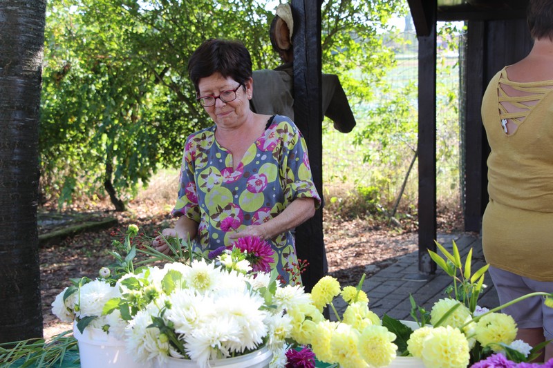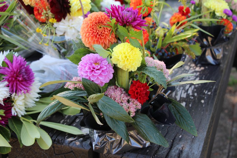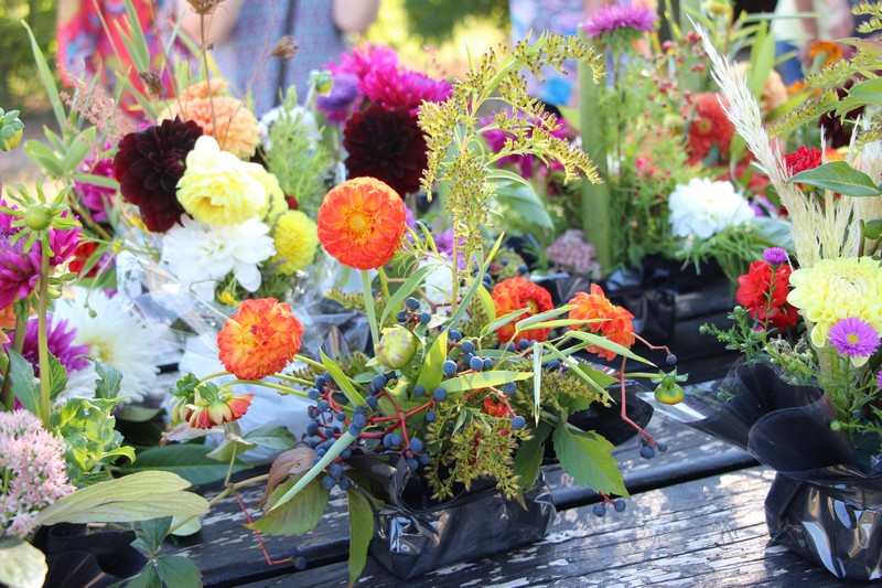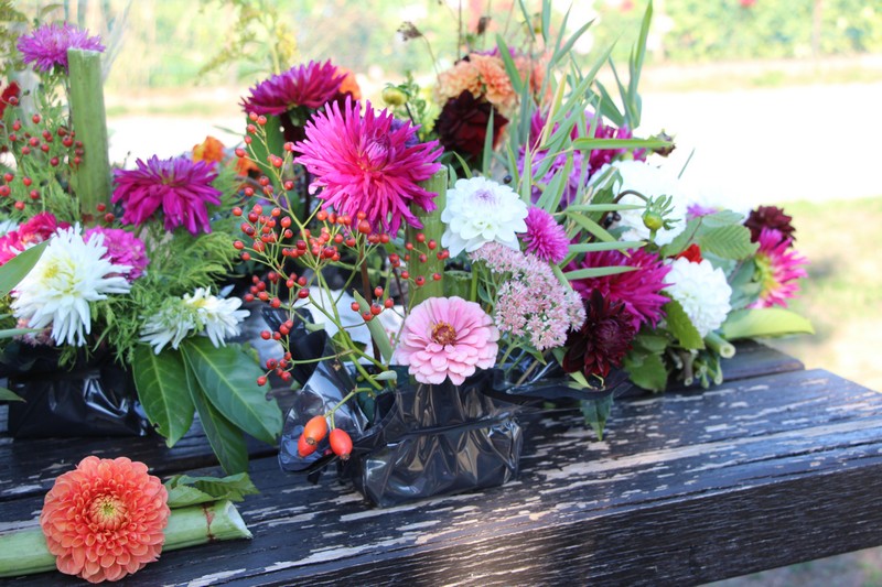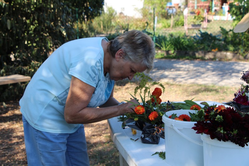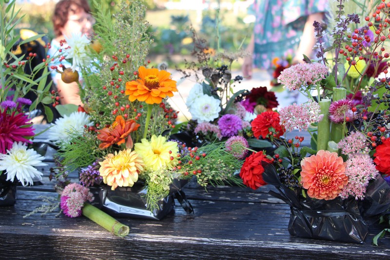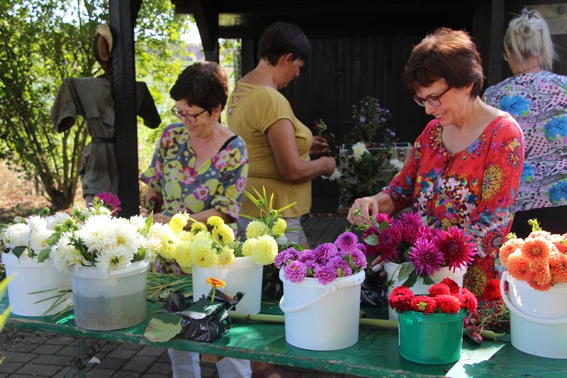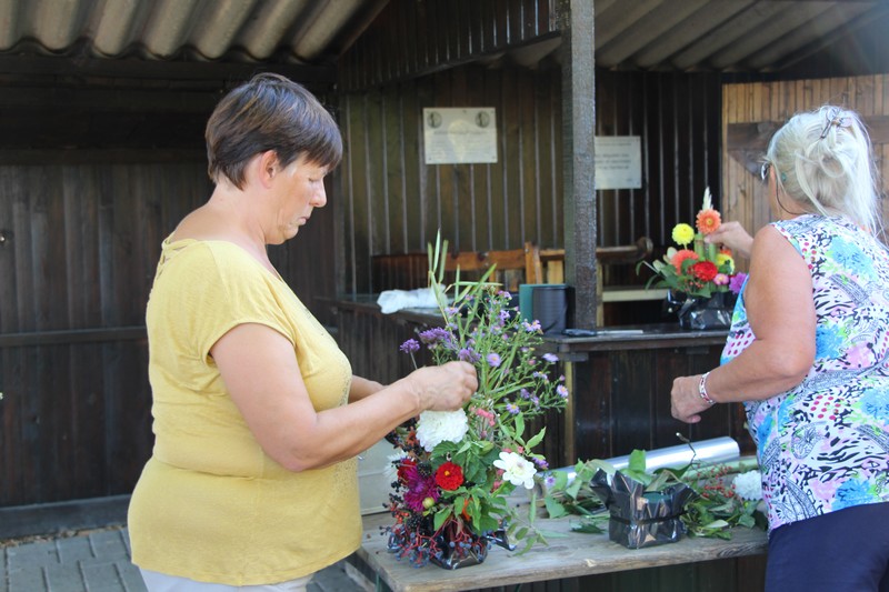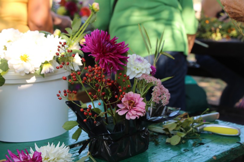 Tous les éléments cueillis viennent rejoindre les fleurs de dahlia, roses, verveine, brins de lavande et autres fleurs déjà sur les tables. Christophe donne quelques consignes pour le piquage dans la mousse puis chacune peut exprimer son talent. Les premiers arrangements floraux prennent forme et Christophe prodigue quelques conseils pour les rendre encore plus harmonieux.
