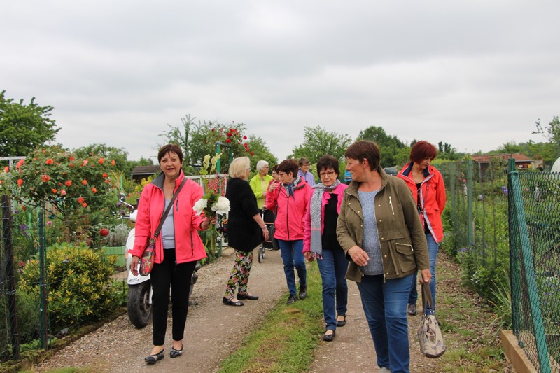 Samedi 30 juin, premier après-midi festif de la saison estivale, sur le site de jardins de la route de Colmar : Dès 14h, en pleine canicule, l’animation mensuelle « 1 heure au jardin », permettait d’échanger des conseils de jardinage avec des membres de l’association au travers de la visite commentée de deux jardins. Concombres thaï, courgettes, aubergines, poivrons et piments, coriandre et basilics thaï, cultivés sur des planches en permaculture ou sous paillis de foin, faisaient la fierté de Patrice qui présentait son jardin. Taille et entretien des melons et des tomates, multiplication des fraisiers, semis d’été au potager, semis des fleurs bisannuelles telles les pensées, pâquerettes ou myosotis étaient ensuite à l’ordre du jour dans le jardin de Didier.