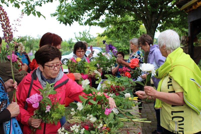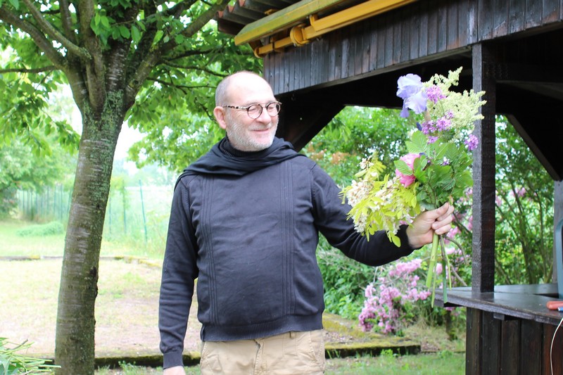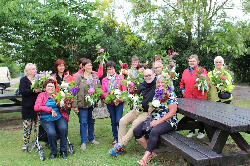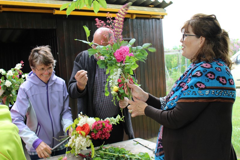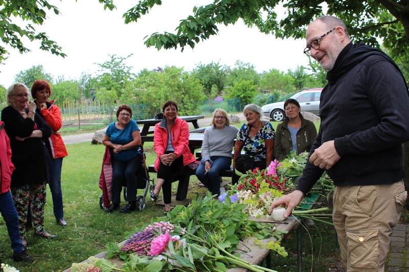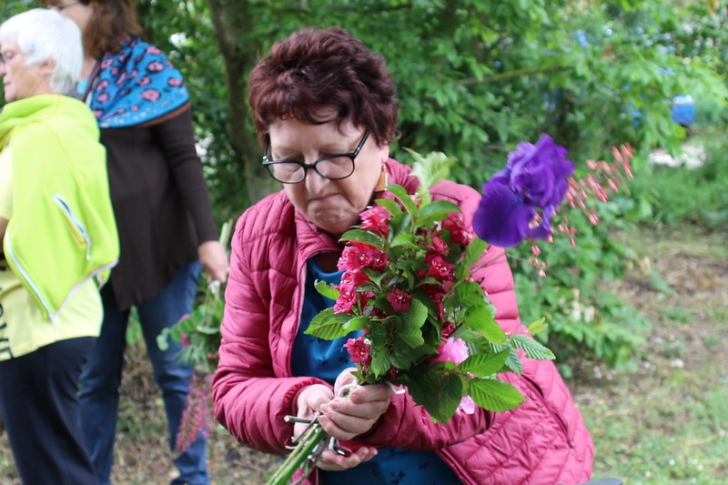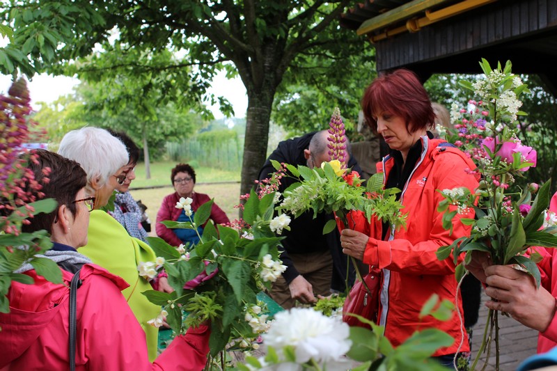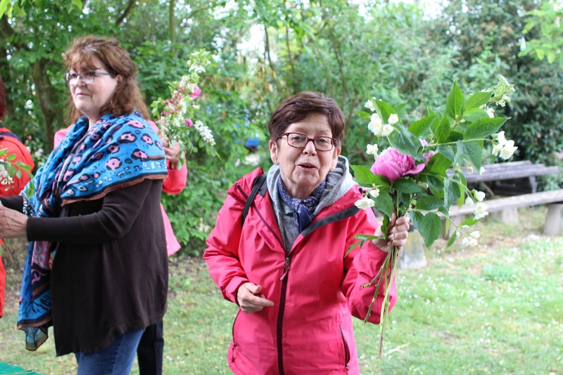 Tous les éléments sont là, en vrac sur la table pour que l'artiste qu'est Christophe exprime son talent. De la julienne des jardins, un iris, une pivoine blanche, une fleur de rhubarbe, une branche de sureau et quelques feuilles de charme, et voilà le premier bouquet qui prend forme. Les fleurs sont là, sur la table. Chaque participant(e), et oui, il y avait Alfred, confectionne son bouquet avec les conseils de Christophe. Le tas de fleurs sur la table s'épuise. Reste à faire quelques photos, boire un thé préparé par Éliane et se donner rendez-vous le 17 septembre prochain 2018 pour la confection de piquages dans la mousse.