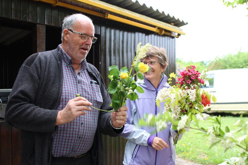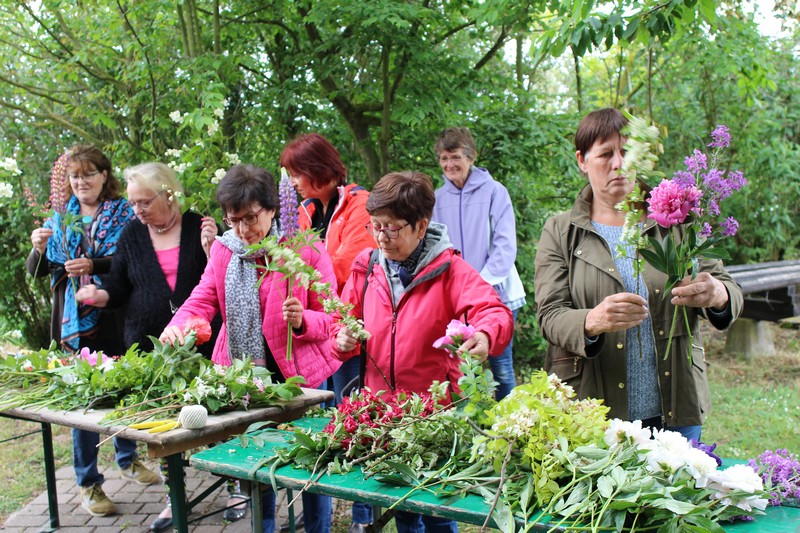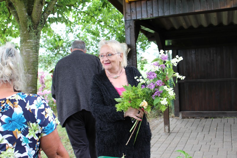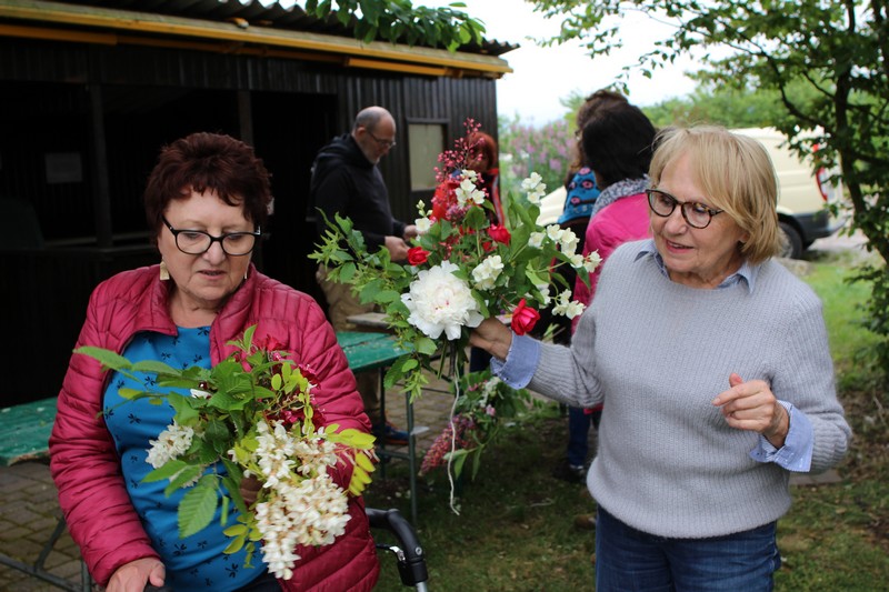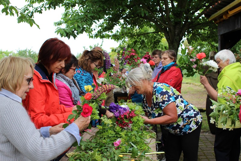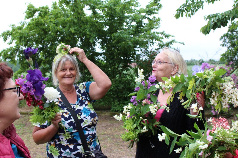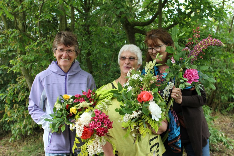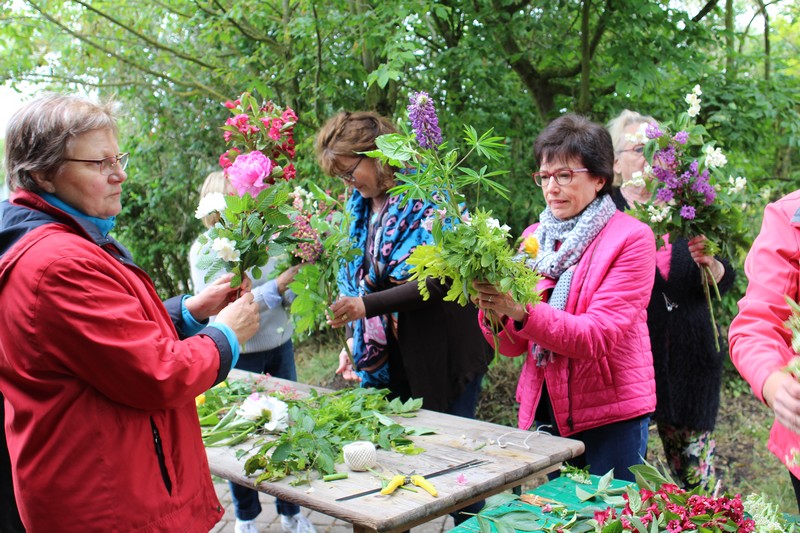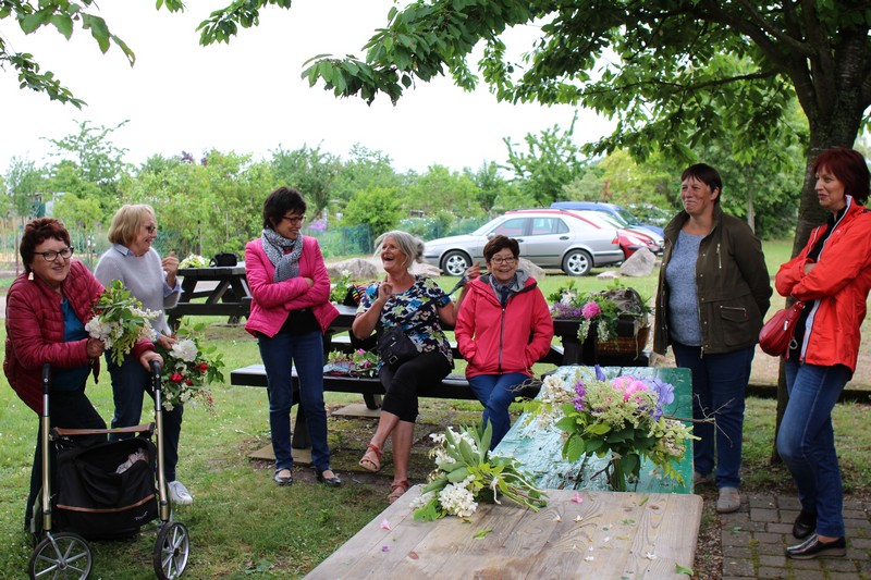 Tous les éléments sont là, en vrac sur la table pour que l'artiste qu'est Christophe exprime son talent. De la julienne des jardins, un iris, une pivoine blanche, une fleur de rhubarbe, une branche de sureau et quelques feuilles de charme, et voilà le premier bouquet qui prend forme. Les fleurs sont là, sur la table. Chaque participant(e), et oui, il y avait Alfred, confectionne son bouquet avec les conseils de Christophe. Le tas de fleurs sur la table s'épuise. Reste à faire quelques photos, boire un thé préparé par Éliane et se donner rendez-vous le 17 septembre prochain 2018 pour la confection de piquages dans la mousse.