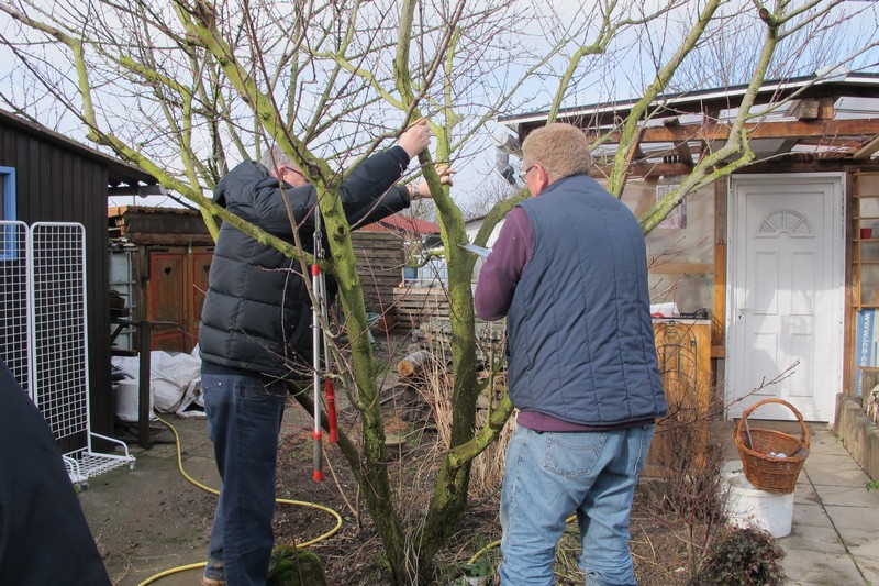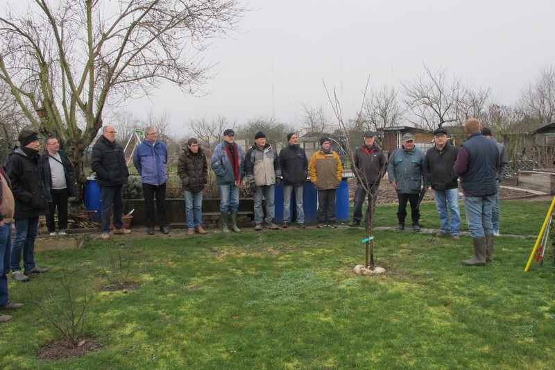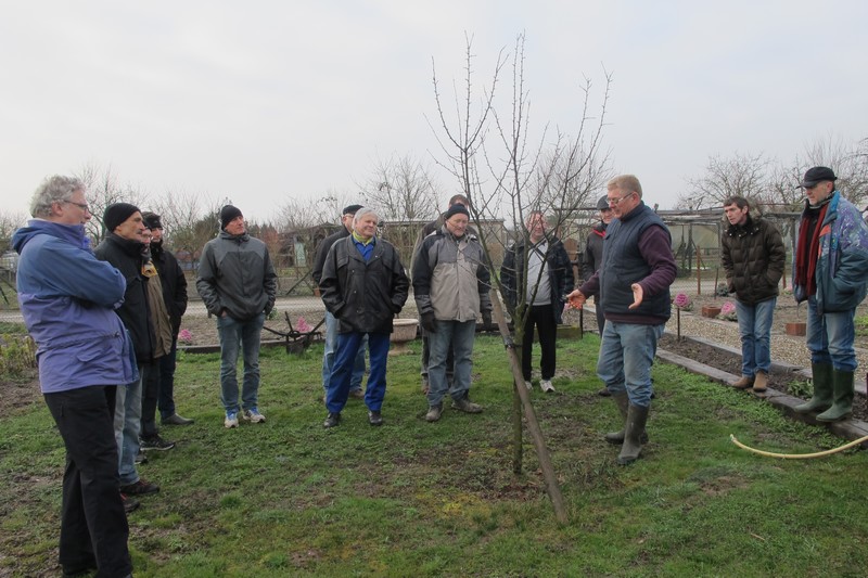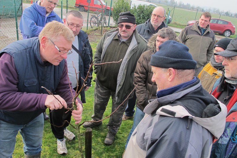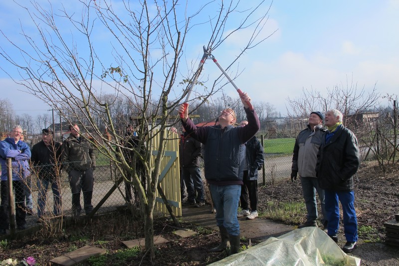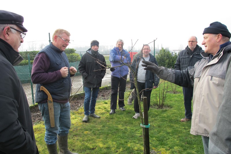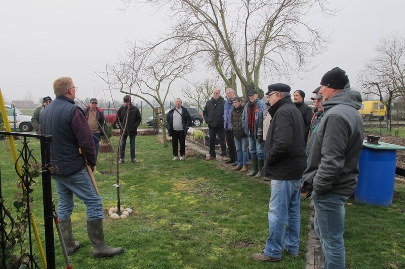 Dimanche 18 février : Cours de taille des arbres fruitiers, avec Patrick KUNSTLER. Plus d'une quinzaine de jardiniers ont bravé le froid. Première halte dans le jardin de Pierre pour des conseils sur la taille et la culture des abricotiers. Vient ensuite le quetschier de Jean-Michel, planté à l'automne 2015 qui nécessite une taille d'entretien. Dans le jardin d'Alfred, les fruitiers sont plus âgés et nécessitent une taille bien plus sévère. Cerisier griotte, pêcher et quetschier sont bien éclaircis. Un détour par le jardin de Michel pour des conseils sur la taille d'un vieux pommier ou celle d'un non moins vieux cerisier, et la matinée se termine par des conseils sur l'entretien et la désinfection des outils de taille, des consignes de sécurité pour ... la cueillette à venir. Un grand merci à Patrick pour tous ses conseils.