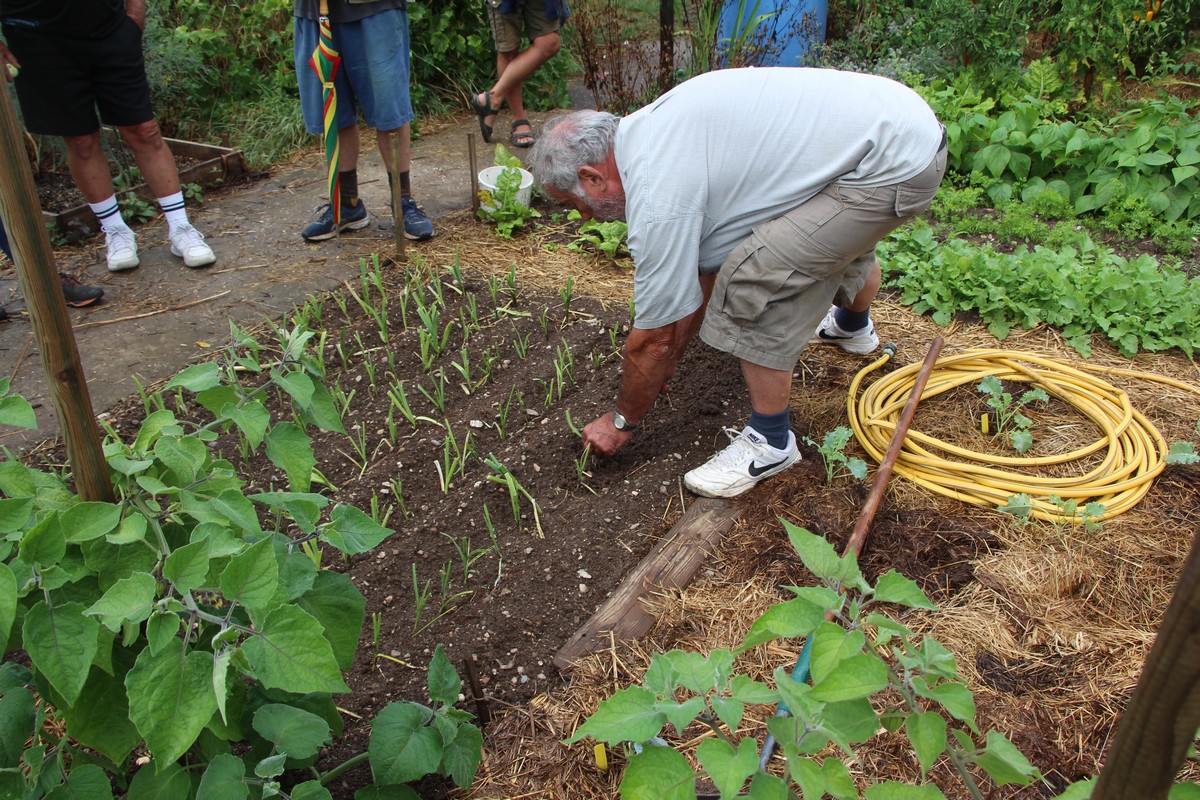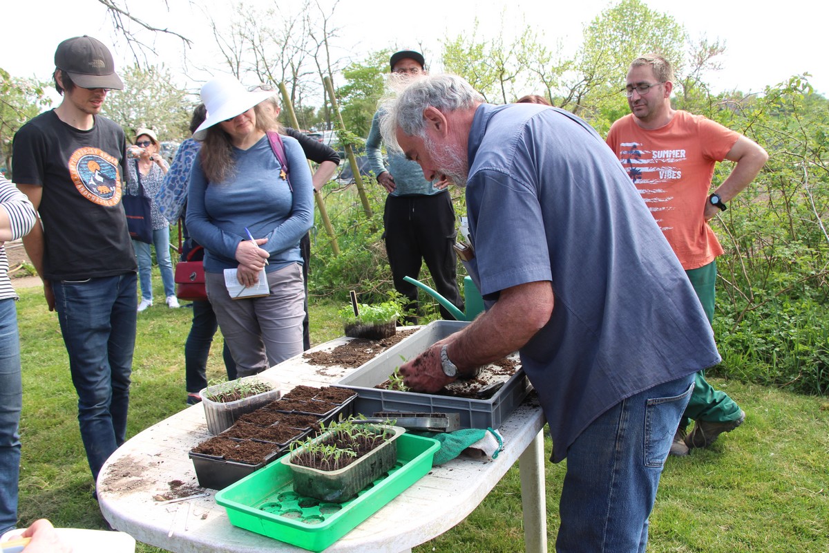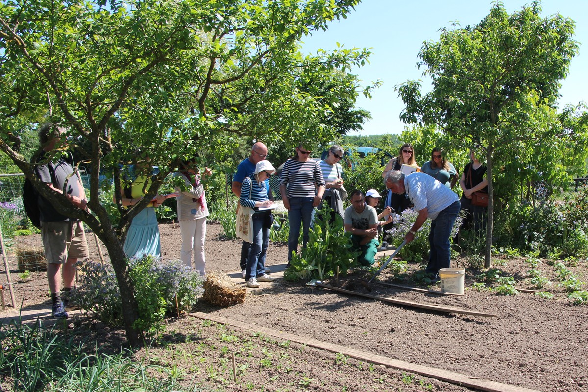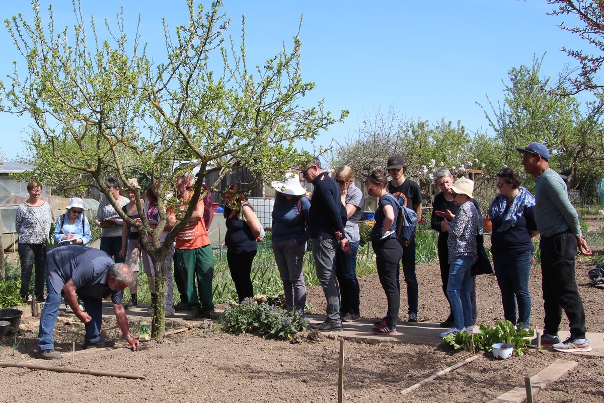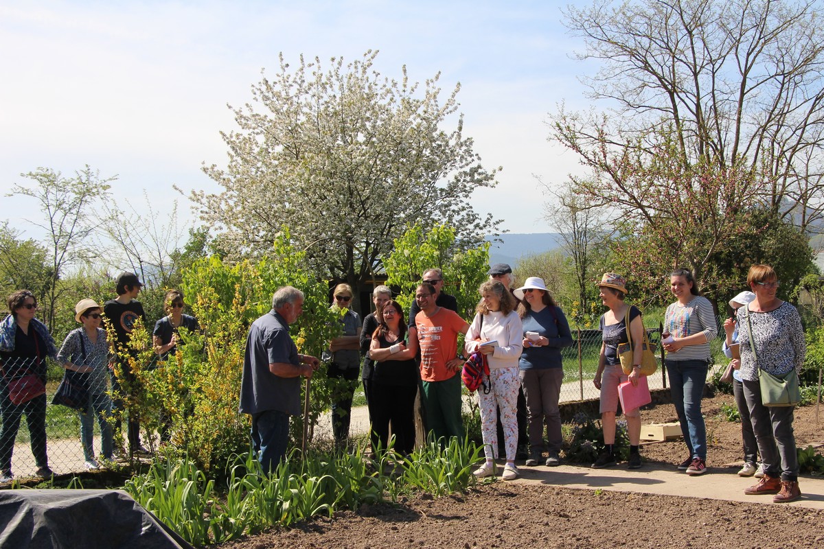 12 avril : Le public est fidèle pour cette première animation "1h au jardin" de la saison qui se déroule sous un soleil estival. Didier accueille un groupe d'une quinzaine de jardinier(e)s dans son jardin. Le lilas étant en fleur, il plante quelques replants de pomme de terre "Désirée", fait remarquer les poireaux "jaune gros du Poitou" qui sont de belle taille, les pieds de bette qui parsèment le jardin, découvre le pissenlit forcé sous tunnel noir, paille la nouvelle plantation de fraisiers. Les pois à grain rond sont déjà bien démarré, l'époque est maintenant propice à semer les pois à grain ridé, ce qui est fait promptement. De même le jardinier explique la manière de semer les radis demi-longs ou longs avant de repiquer en godets de jeunes replants de tomate issus de la serre ou des plantules de céleri rave. La séance s'achève par le partage de replants d'ancolie.