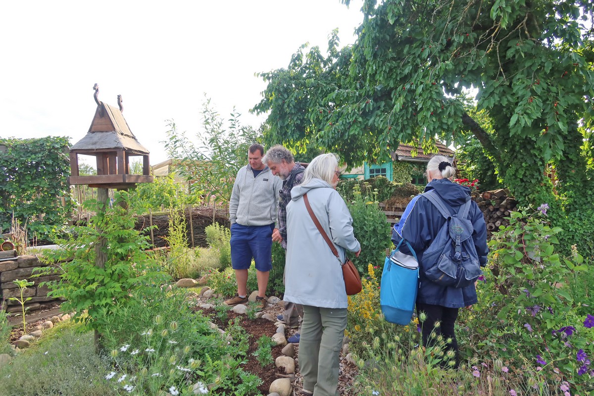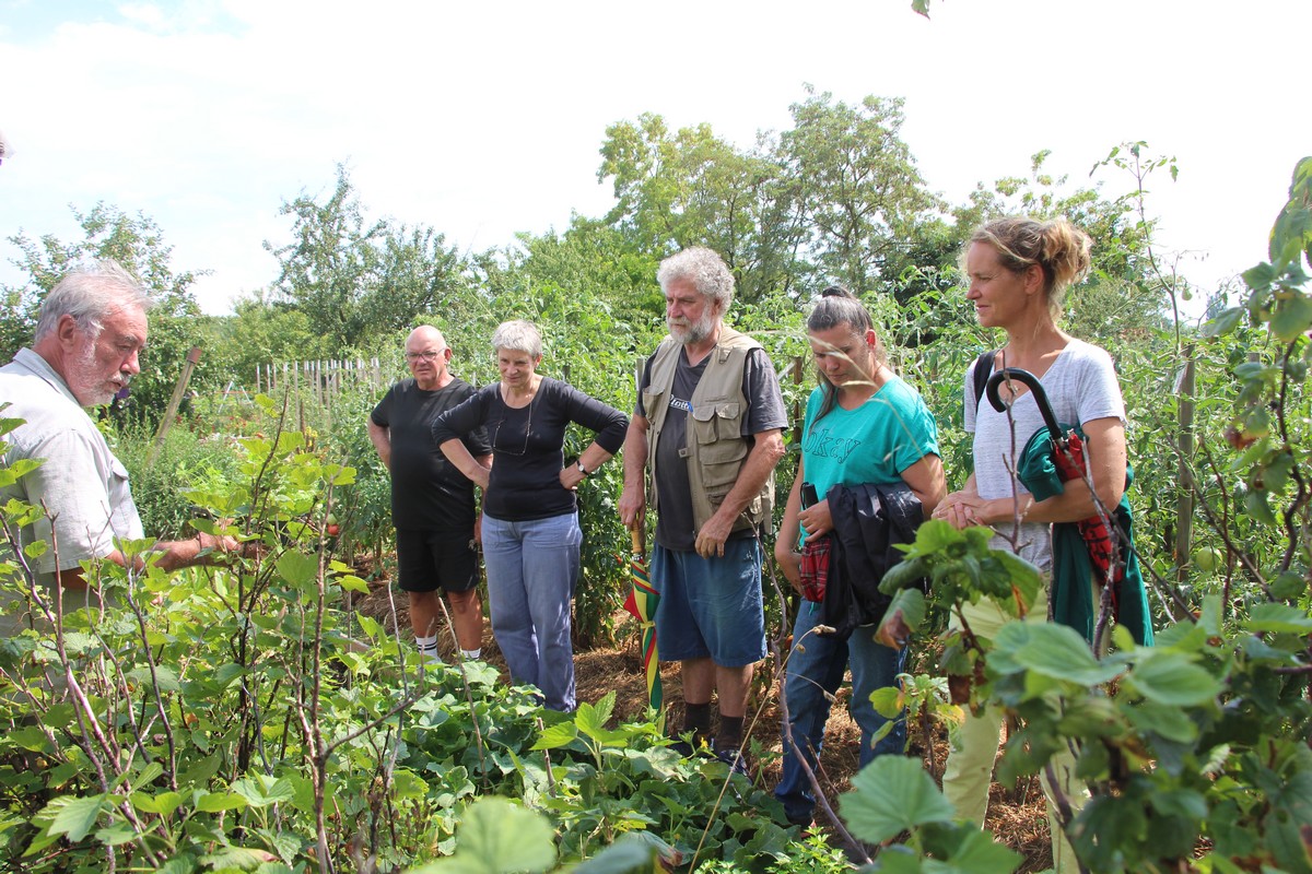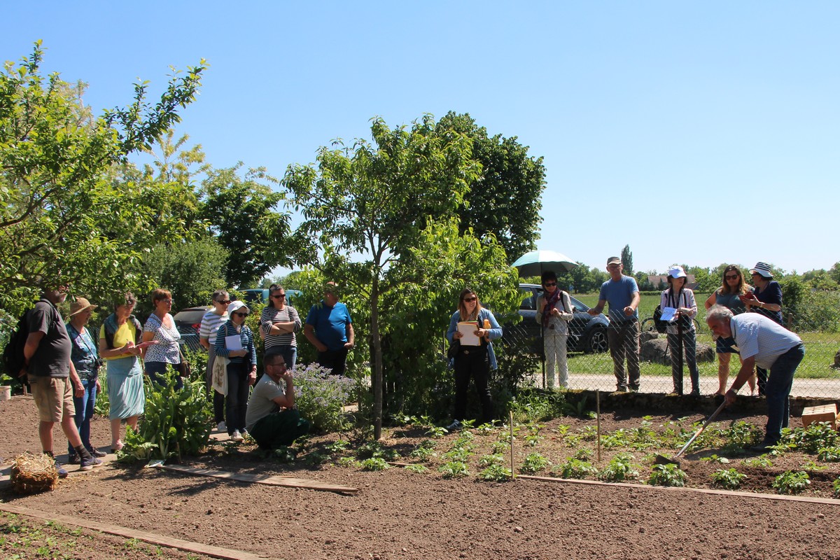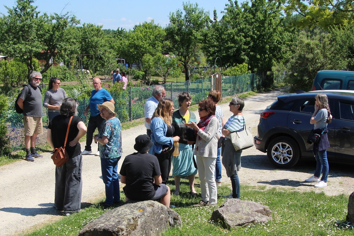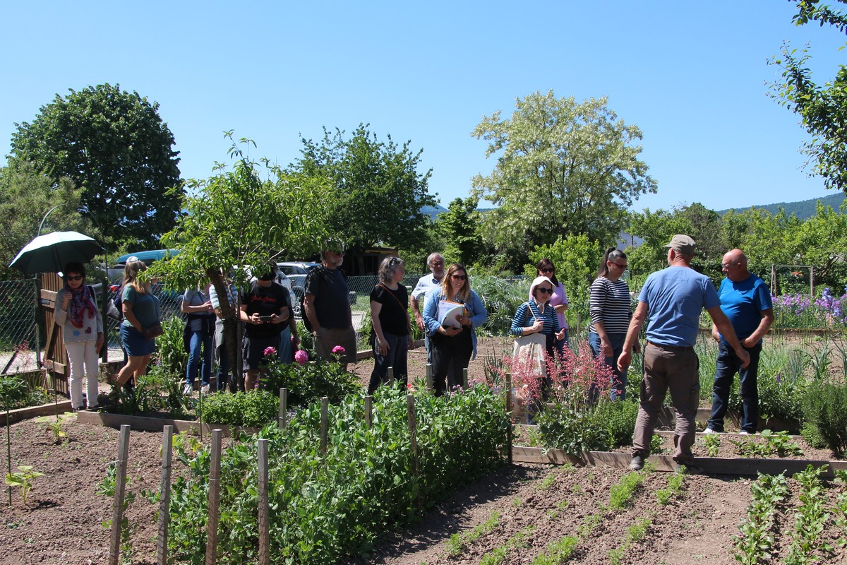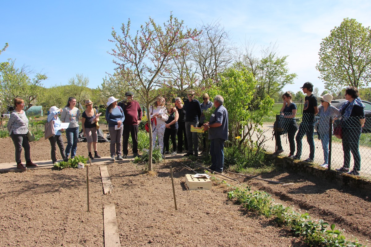10 mai : "1h au jardin". Seconde animation jardinage de la saison. Bien que la date de l'animation n'ait été rappelée que la veille, jardinières et jardiniers sont au rendez-vous. Il fait chaud pour une mi-mai. Petit tour dans le jardin qu'Yvan cultive depuis tout juste une année. Un bien joli jardin tant pour les légumes que pour les fleurs ! Yvan nous fait découvrir son écrin avec passion, partageant ses façons de faire. Le groupe se dirige ensuite vers le jardin voisin, celui de Didier. Observation de la plate-bande de dahlias, tout juste plantés après avoir été forcés dans la serre, buttage des pommes de terre, semis de potimarron et de haricots blancs "Nombril de bonne soeur", mise en pleine terre des replants de tomate sont au programme de la visite. Il est déjà 16h passé, le moment pour les participant(e)s à l'animation de se diriger vers la serre pour y récupérer des plants de tomate. Le choix est cornélien parmi la cinquantaine de variétés cultivées par Didier.