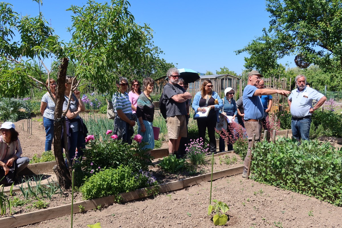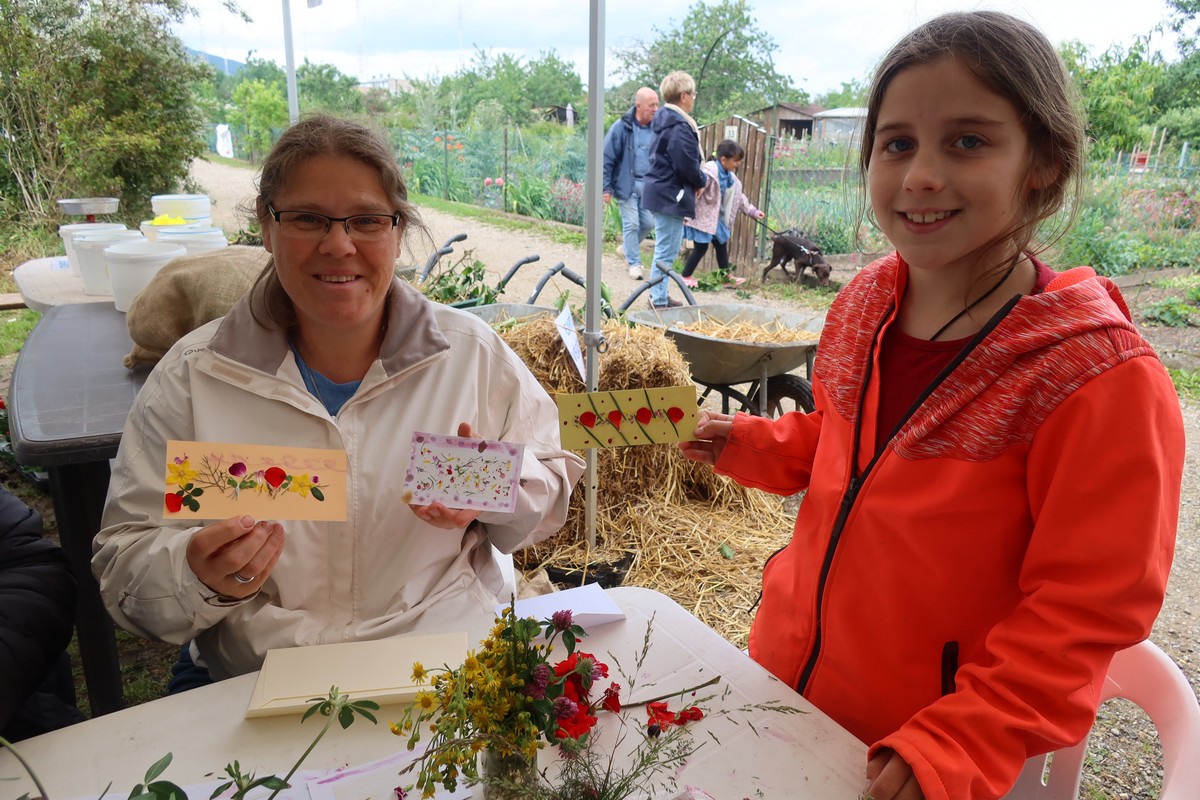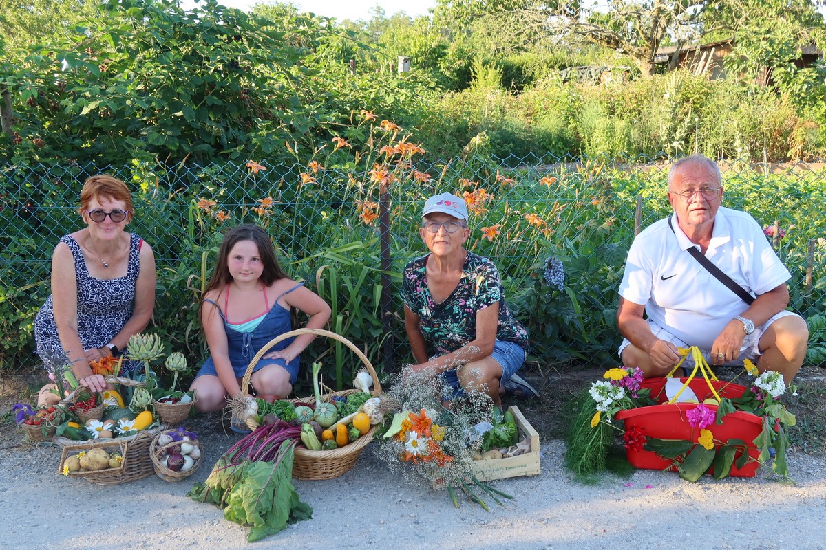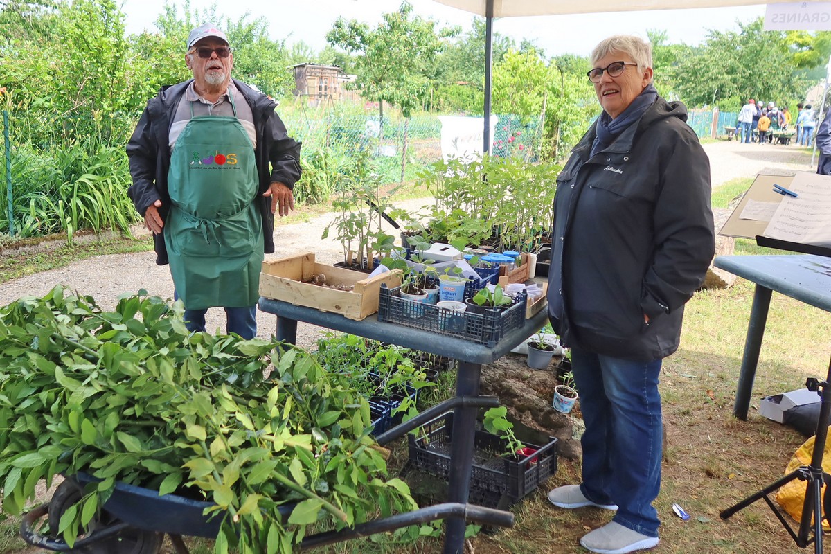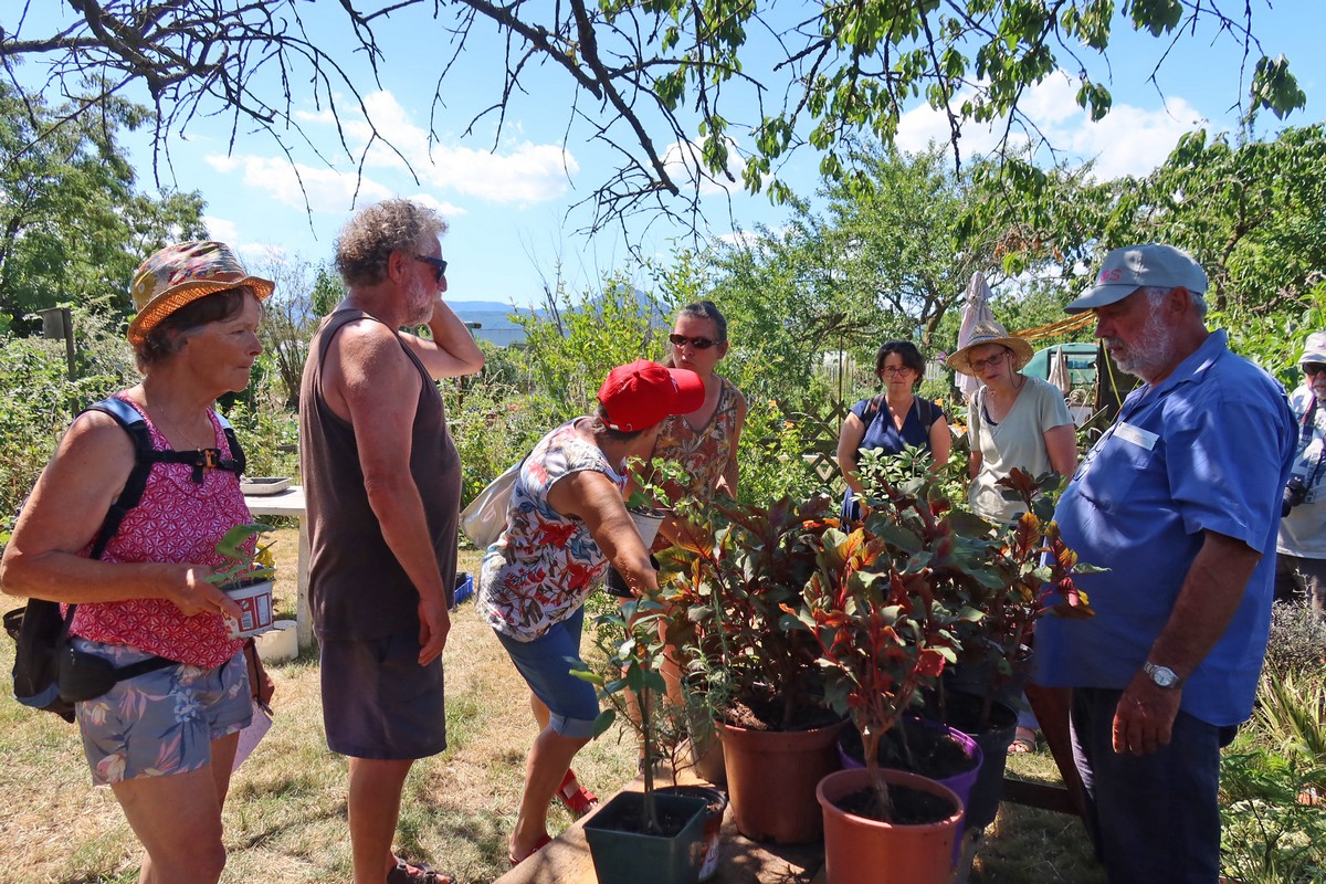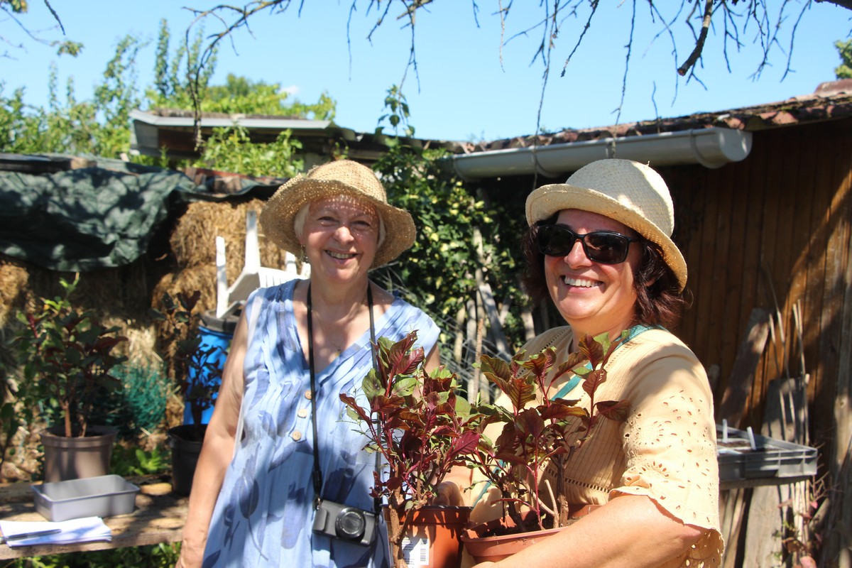 28 juin : Premier des trois après-midi festifs de la saison estivale. L'après-midi débute par l'animation jardinage pratique "1h au jardin". Malgré la canicule, quelques jardinières et jardiniers ont répondu à l'invitation. Petit tour dans le jardin de Didier remis en état après un certain laisser-aller en début de saison, lié aux activités du 100ème anniversaire de l'association. Les dahlias sont en avance par rapport à l'an passé, car ils ont été forcés dans la serre au tout début du printemps. La verveine de Buenos Aires a envahi la planche de fraisier, occasion pour les visiteurs d'en récupérer de jeunes plants. Les oignons, ails et échalotes attendent d'être récoltés, le semis de radis japonais sort de terre, les carottes destinées à être ensilées pour l'hiver sont en train de lever, jouxtant des haricots verts semés en godets et tout juste mis en terre. Sous le cerisier, les semis de choux, de scaroles, chicorées frisées réalisés en mini-mottes tentent de germer malgré les températures caniculaires. Didier évoque l'entretien des tomates et les semis pouvant être effectués en ce début d'été avant de semer en mini-mottes de la chicorée frisée "fine de Louviers". Partage de quelques replants de fleurs, de quelques pieds de sauge décorative avec son feuillage rouge et il est temps de rejoindre le stand où Catherine propose de confectionner de superbes "cartes végétales". Des habitué(e)s, mais également des néophytes composent petits tableaux et marques-pages à partir de pétales de fleurs, brindilles, feuilles. Avec douceur et patience, Catherine guide, suggère, encourage. Les réalisations sont glissées bien à l'abri dans des enveloppes par les participant(e)s ravi(e)s par cette animation. Déjà les premiers paniers sont sur le présentoir pour le concours "Fleurs, fruits et légumes du jardin". 18h, vient le moment de la désignation des plus beaux d'entre eux. Samantha et Thomas BONNET, Marguerite et Alfred STOCK, Alice WITTMER, Fahid HODZIC sont récompensés par des bons d'achat de 15€ offert par le maraicher sélestadien "Le jardinier", bld de Nancy. Jardiniers et jardinières peuvent maintenant se restaurer. Roland et Raymond proposent saucisses blanches ou merguez grillées au barbecue par Gérard, Christiane et Patrick tiennent le stand café-pâtisseries-glaces, tandis que Jean-Paul tient la buvette, très fréquentée et que Fabrice et Valentin assurent l’approvisionnement. Un léger souffle d'air sur l'air de loisirs du Galgenfeld adoucit les températures caniculaires, permettant de terminer un bel après-midi dans la convivialité. Rendez-vous est donné le 26 juillet pour le second après-midi festif de la saison 2025.