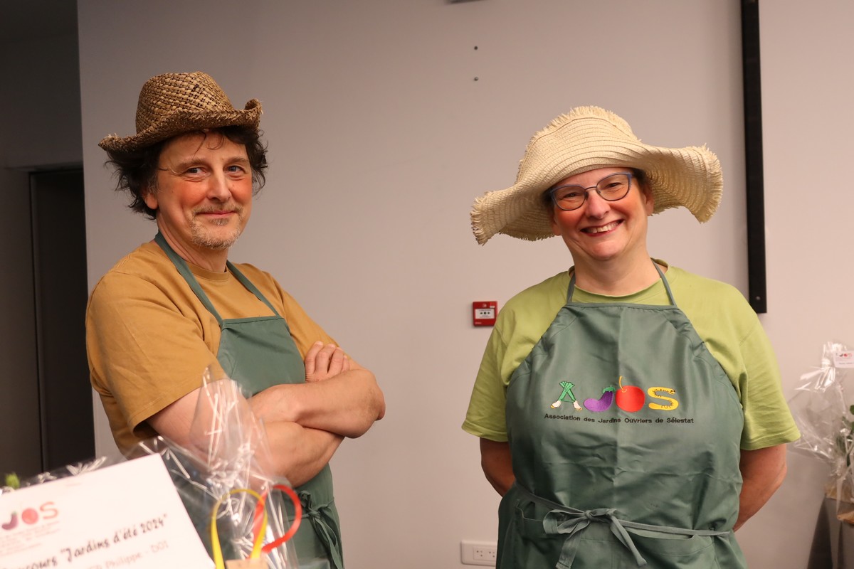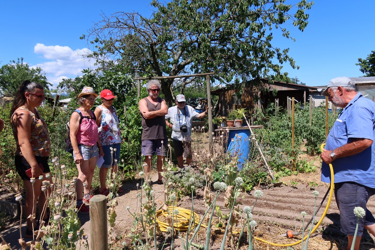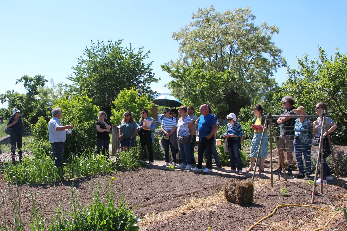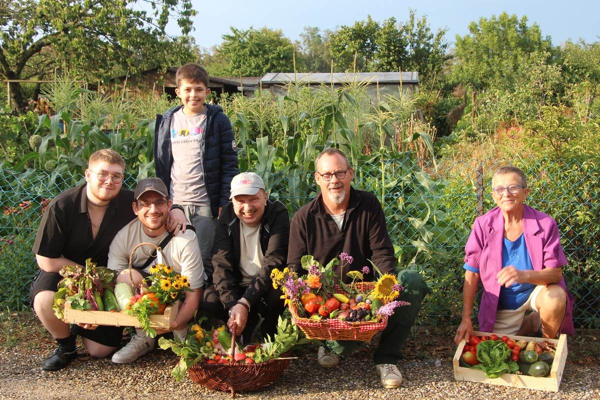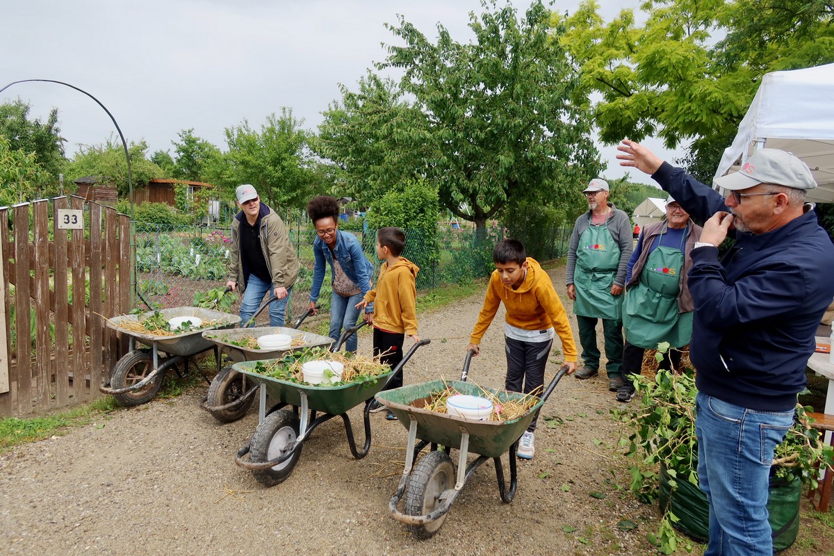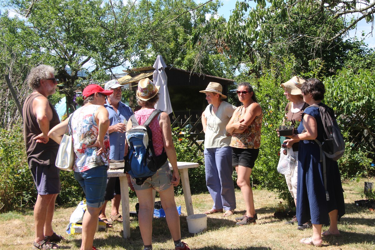 28 juin : Premier des trois après-midi festifs de la saison estivale. L'après-midi débute par l'animation jardinage pratique "1h au jardin". Malgré la canicule, quelques jardinières et jardiniers ont répondu à l'invitation. Petit tour dans le jardin de Didier remis en état après un certain laisser-aller en début de saison, lié aux activités du 100ème anniversaire de l'association. Les dahlias sont en avance par rapport à l'an passé, car ils ont été forcés dans la serre au tout début du printemps. La verveine de Buenos Aires a envahi la planche de fraisier, occasion pour les visiteurs d'en récupérer de jeunes plants. Les oignons, ails et échalotes attendent d'être récoltés, le semis de radis japonais sort de terre, les carottes destinées à être ensilées pour l'hiver sont en train de lever, jouxtant des haricots verts semés en godets et tout juste mis en terre. Sous le cerisier, les semis de choux, de scaroles, chicorées frisées réalisés en mini-mottes tentent de germer malgré les températures caniculaires. Didier évoque l'entretien des tomates et les semis pouvant être effectués en ce début d'été avant de semer en mini-mottes de la chicorée frisée "fine de Louviers". Partage de quelques replants de fleurs, de quelques pieds de sauge décorative avec son feuillage rouge et il est temps de rejoindre le stand où Catherine propose de confectionner de superbes "cartes végétales". Des habitué(e)s, mais également des néophytes composent petits tableaux et marques-pages à partir de pétales de fleurs, brindilles, feuilles. Avec douceur et patience, Catherine guide, suggère, encourage. Les réalisations sont glissées bien à l'abri dans des enveloppes par les participant(e)s ravi(e)s par cette animation. Déjà les premiers paniers sont sur le présentoir pour le concours "Fleurs, fruits et légumes du jardin". 18h, vient le moment de la désignation des plus beaux d'entre eux. Samantha et Thomas BONNET, Marguerite et Alfred STOCK, Alice WITTMER, Fahid HODZIC sont récompensés par des bons d'achat de 15€ offert par le maraicher sélestadien "Le jardinier", bld de Nancy. Jardiniers et jardinières peuvent maintenant se restaurer. Roland et Raymond proposent saucisses blanches ou merguez grillées au barbecue par Gérard, Christiane et Patrick tiennent le stand café-pâtisseries-glaces, tandis que Jean-Paul tient la buvette, très fréquentée et que Fabrice et Valentin assurent l’approvisionnement. Un léger souffle d'air sur l'air de loisirs du Galgenfeld adoucit les températures caniculaires, permettant de terminer un bel après-midi dans la convivialité. Rendez-vous est donné le 26 juillet pour le second après-midi festif de la saison 2025.