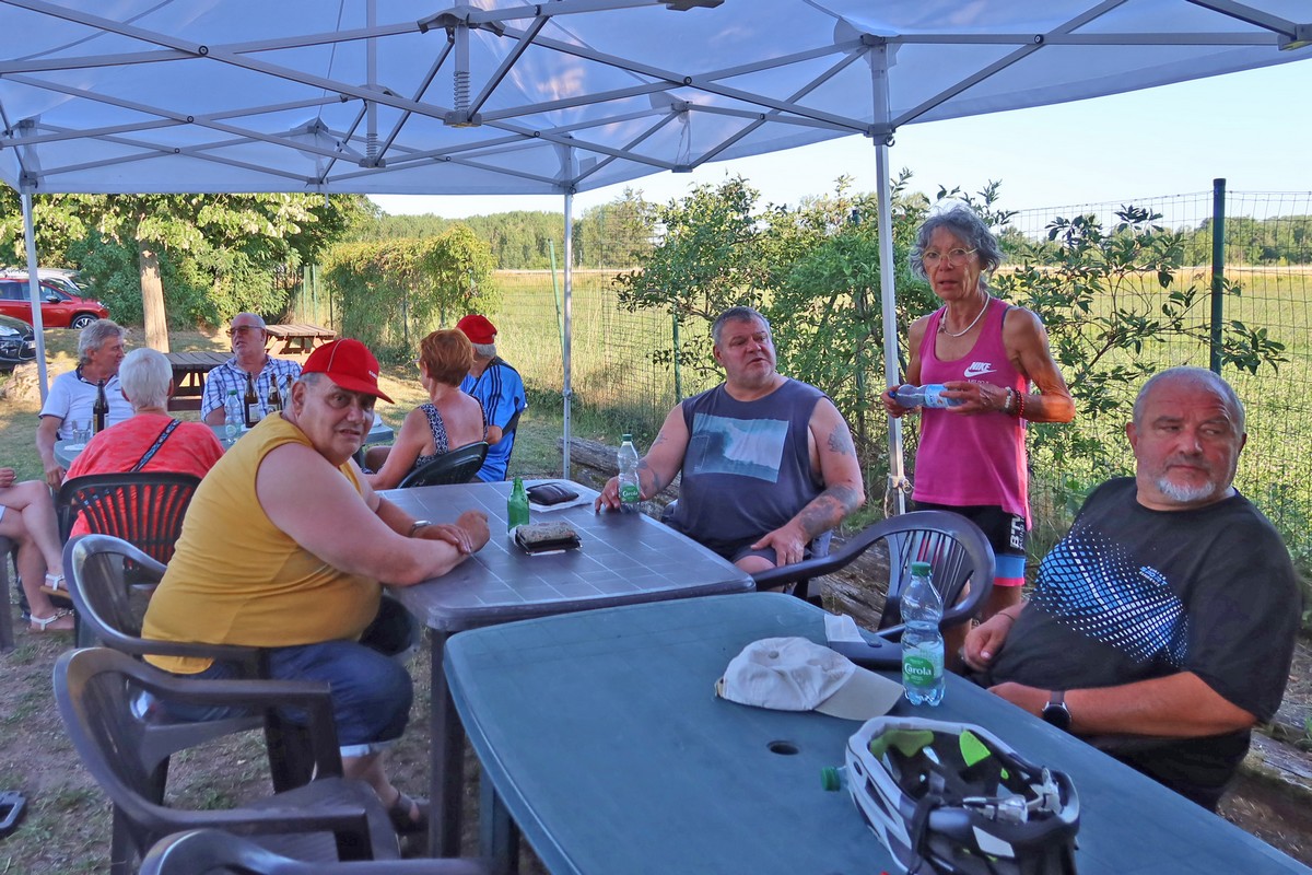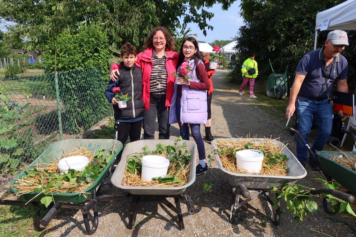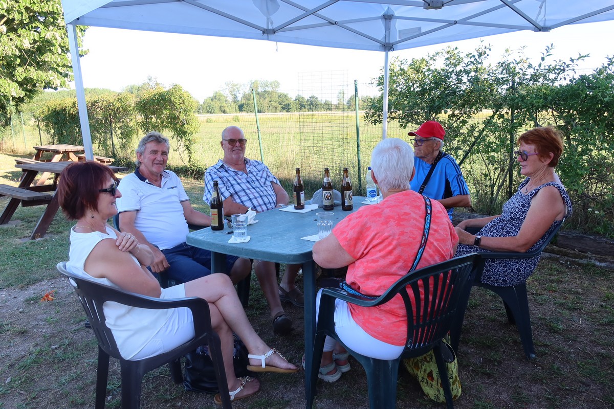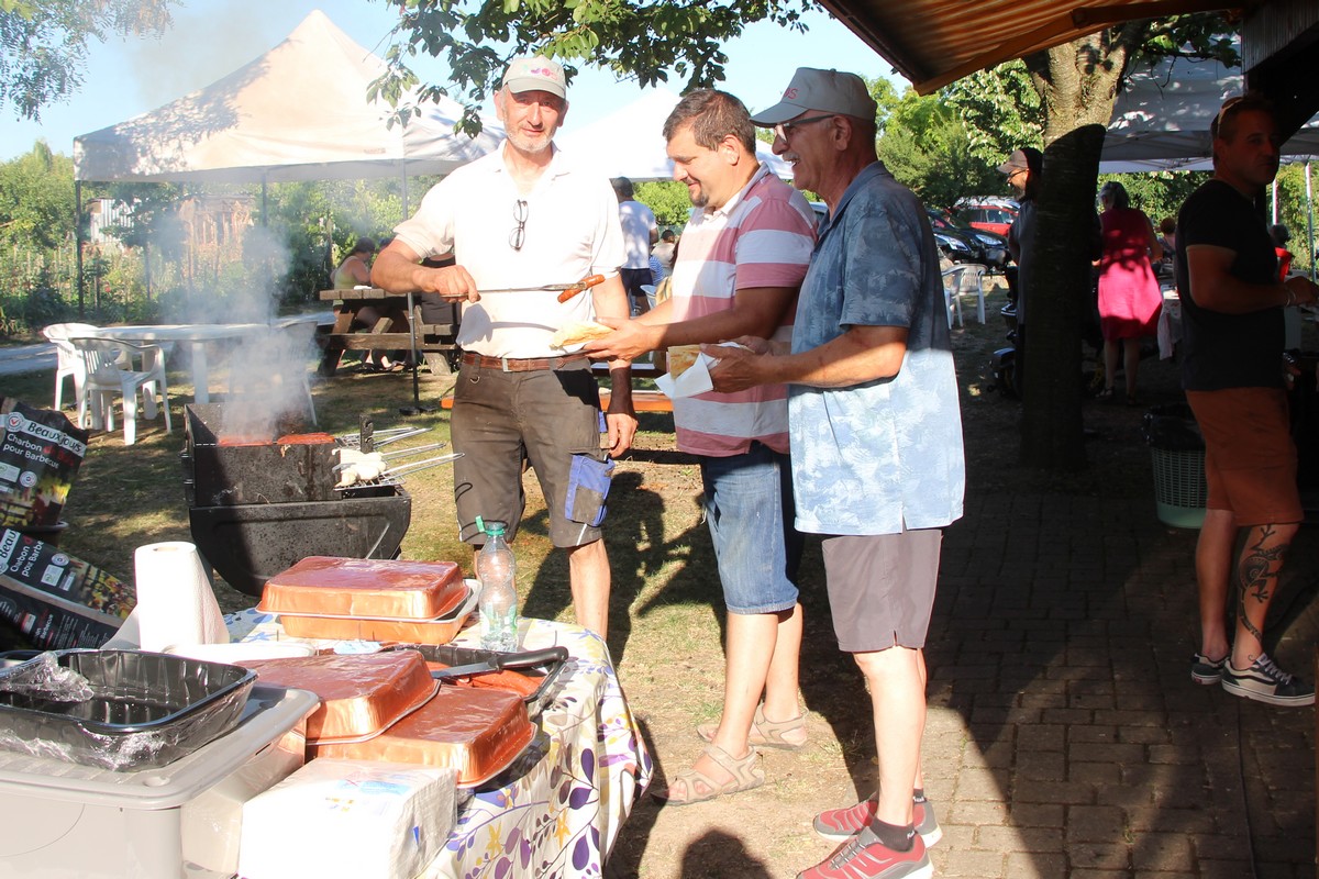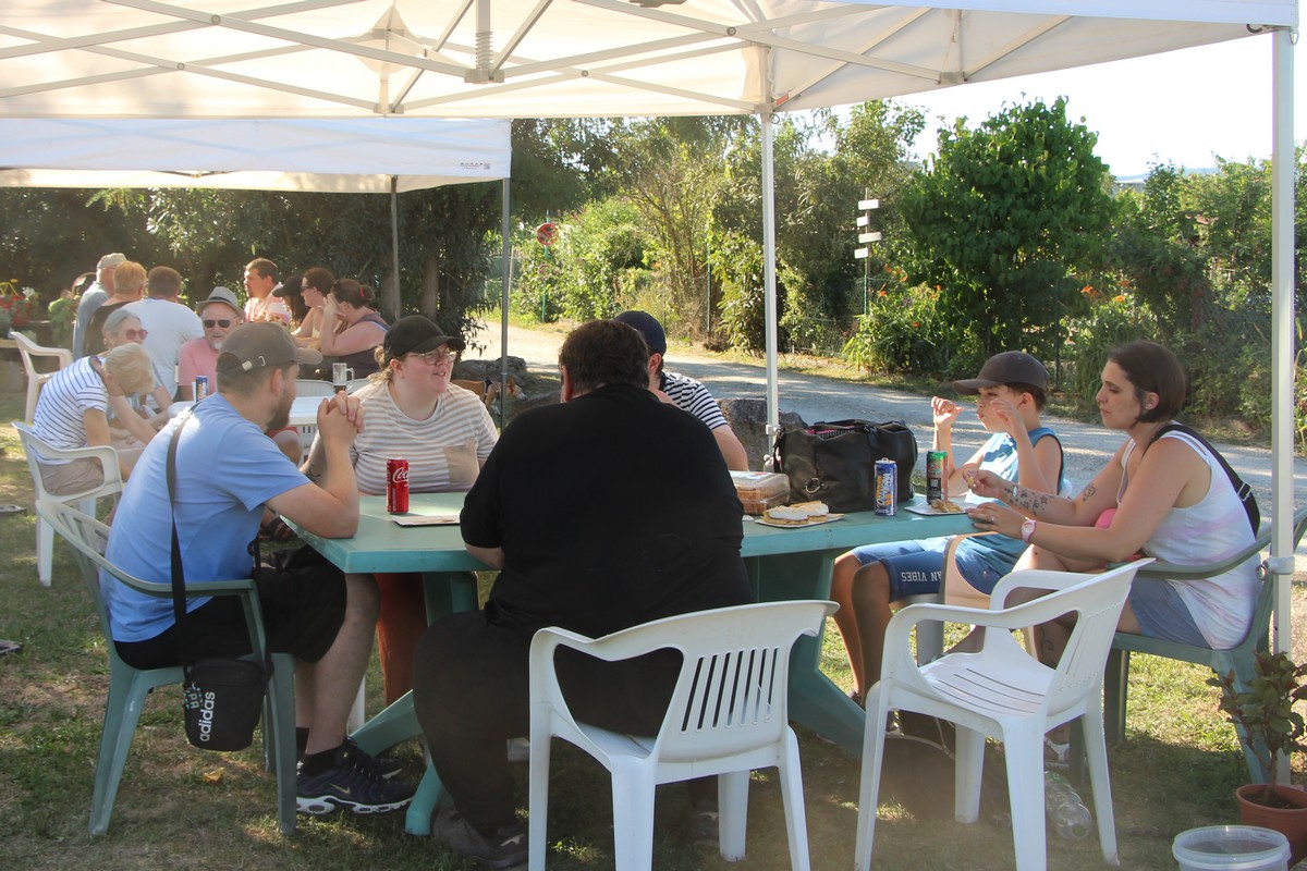 26 juillet : Second des trois après-midi festifs de la saison estivale. Le temps est à l'orage, nous attendons la pluie depuis des semaines, les jardins sont très secs et l'arrosage devient une corvée. Vers 13h30, des trombes d'eau s'abattent sur la ville, puis la pluie cesse pour 14h. Les premiers jardiniers et jardinières arrivent pour l'animation jardinage "1h au jardin" qui débute avec un petit quart d'heure de retard. Seule, la visite du jardin de Didier est au programme, le ciel reste menaçant. Petit tour du jardin en distillant quelques conseils sur la culture des dahlias, des melons, des haricots ou des tomates, repiquage de replants de poireaux, entretien des fraisiers et préparation des replants à partir des stolons, distribution de replants de verveine de Buenos Aires, l'ambiance est conviviale et le temps file. Reste à évoquer rapidement la taille des framboisiers avant de se réfugier sous les tonnelles de l'aire de loisirs. Il est presque 16h, l'heure de déguster l'une des pâtisseries proposées par Christiane et Patrick. Les premiers paniers du concours tarderont à arriver, les jardiniers et jardinières devant composer avec les nombreuses averses. 18h30, vient le moment de la désignation des plus beaux paniers. Fabrice UTTARD (A137), Patrick TASSIN (A35), Emmanuel KEMPF (A39) et Alice WITTEMER (B49) sont récompensés par des bons d'achat de 15€ offert par le maraicher sélestadien "Le jardinier", bld de Nancy. Gérard parvient à cuire merguez et saucisses blanches... à l'abri du store pour satisfaire l'appétit des membres qui ont bravé la pluie. Les tonnelles sont fort utiles et permettent de se retrouver entre amis ou en famille autour d'une table jusqu'à presque 20h. Rendez-vous est donné le 30 août pour le dernier après-midi festif de la saison 2025.