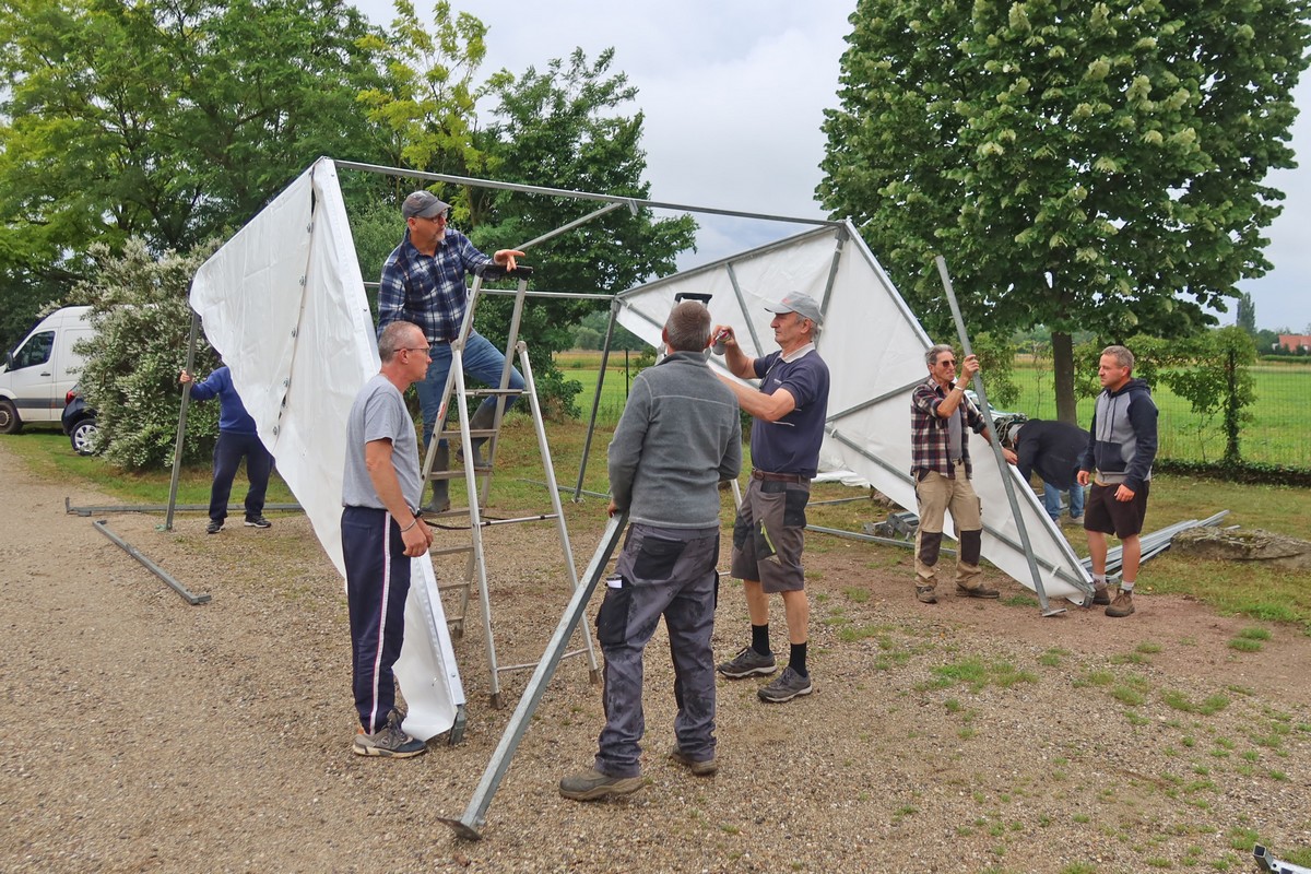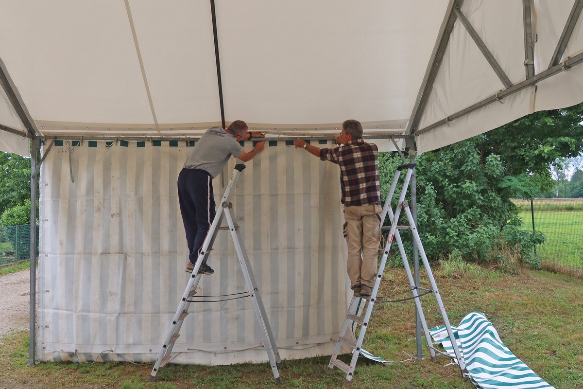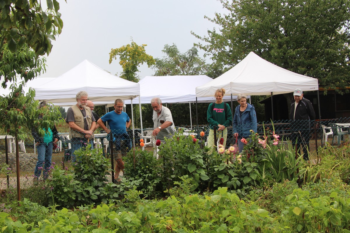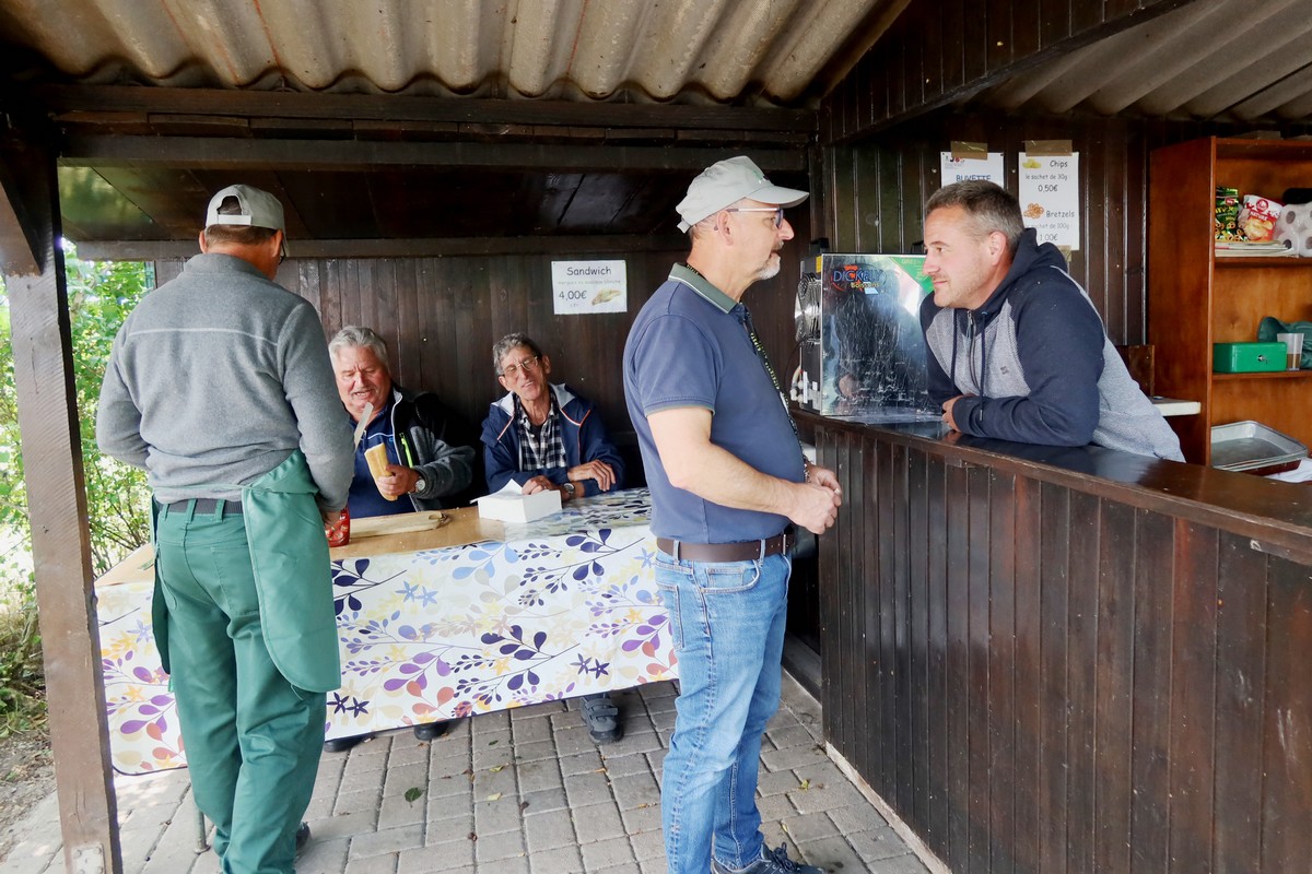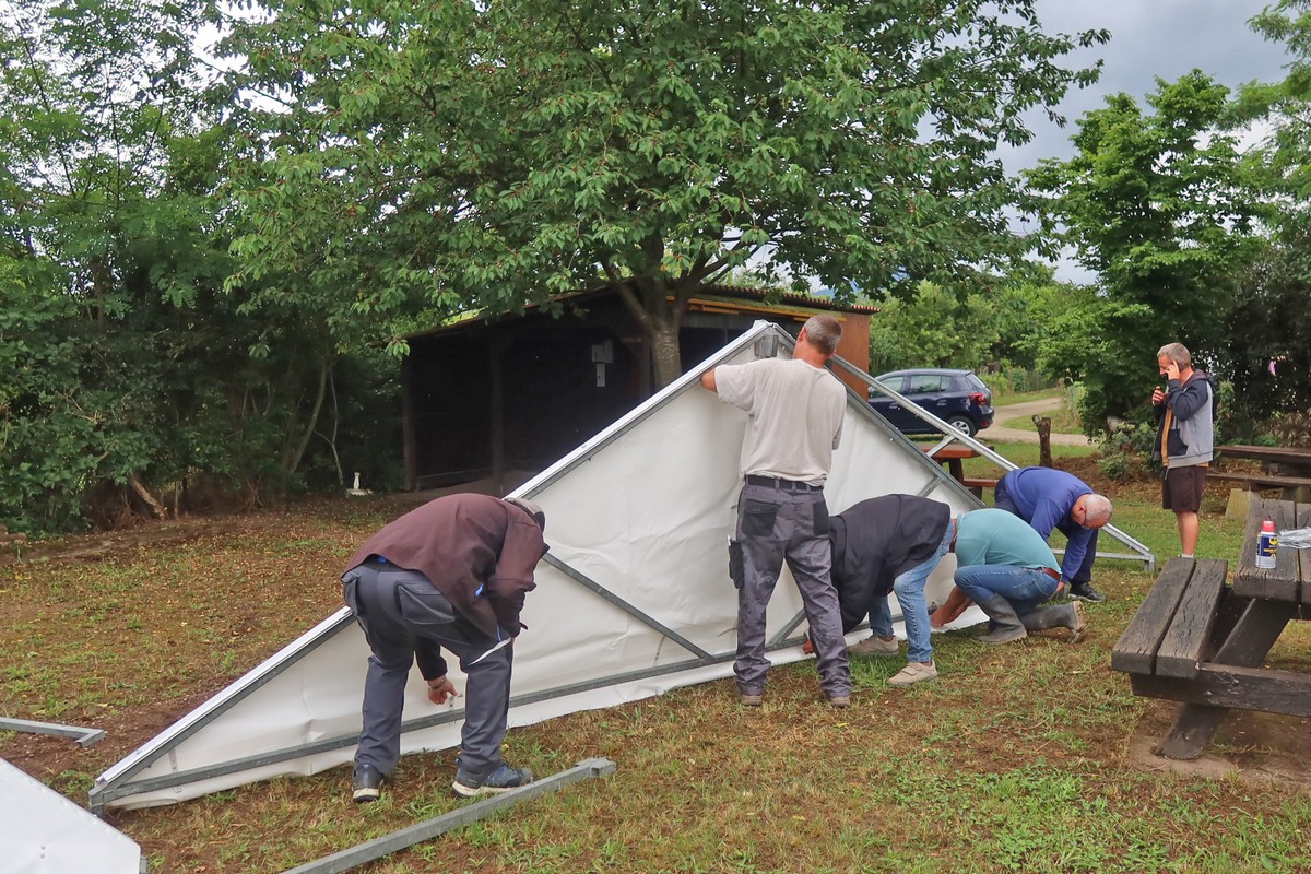 26 juillet : Second des trois après-midi festifs de la saison estivale. Le temps est à l'orage, nous attendons la pluie depuis des semaines, les jardins sont très secs et l'arrosage devient une corvée. Vers 13h30, des trombes d'eau s'abattent sur la ville, puis la pluie cesse pour 14h. Les premiers jardiniers et jardinières arrivent pour l'animation jardinage "1h au jardin" qui débute avec un petit quart d'heure de retard. Seule, la visite du jardin de Didier est au programme, le ciel reste menaçant. Petit tour du jardin en distillant quelques conseils sur la culture des dahlias, des melons, des haricots ou des tomates, repiquage de replants de poireaux, entretien des fraisiers et préparation des replants à partir des stolons, distribution de replants de verveine de Buenos Aires, l'ambiance est conviviale et le temps file. Reste à évoquer rapidement la taille des framboisiers avant de se réfugier sous les tonnelles de l'aire de loisirs. Il est presque 16h, l'heure de déguster l'une des pâtisseries proposées par Christiane et Patrick. Les premiers paniers du concours tarderont à arriver, les jardiniers et jardinières devant composer avec les nombreuses averses. 18h30, vient le moment de la désignation des plus beaux paniers. Fabrice UTTARD (A137), Patrick TASSIN (A35), Emmanuel KEMPF (A39) et Alice WITTEMER (B49) sont récompensés par des bons d'achat de 15€ offert par le maraicher sélestadien "Le jardinier", bld de Nancy. Gérard parvient à cuire merguez et saucisses blanches... à l'abri du store pour satisfaire l'appétit des membres qui ont bravé la pluie. Les tonnelles sont fort utiles et permettent de se retrouver entre amis ou en famille autour d'une table jusqu'à presque 20h. Rendez-vous est donné le 30 août pour le dernier après-midi festif de la saison 2025.