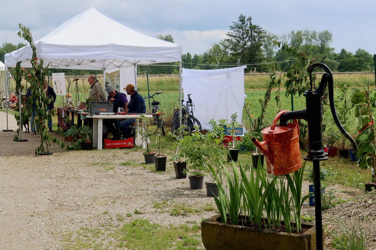 8 juin : Portes ouvertes au Galgenfeld dans le cadre de la journée nationale "Rendez-vous aux jardins". Pluie et vent sont au rendez-vous de cette journée que nous souhaitions festive. Les visiteurs ayant bravé ces conditions météorologiques peu favorables se sont dits toutefois satisfaits de ce que nous proposions, et c'est là l'essentiel. La Société Mycologique du Centre Alsace (SMCA) et l'Association des Arboriculteurs de Sélestat et environs présentaient leurs activités, tandis qu'expositions d'outils anciens, de conserves comme autrefois, d'herbes aromatiques sous forme de quiz attiraient l'attention des visiteurs. Les courses de brouettes pour lesquelles vitesse et douceur étaient requises afin de ramener un maximum d'eau dans les seaux ont créé de l'animation, tandis que l'animation "Cartes végétales" de Catherine a remporté son habituel succès. Le troc plants a également été prisé des jardinières et jardiniers, tout comme... le stand pâtisserie-café. La bière a quant à elle été consommée avec beaucoup de modération... météo oblige. Quelques photos de cette journée, prises... lors d'éclaircies :